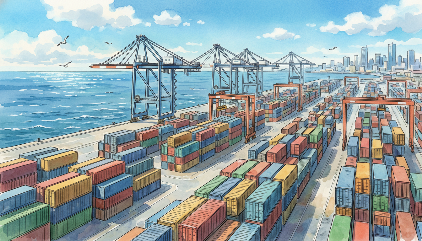 昼のコンテナターミナル全景|物流・港湾イラスト素材
