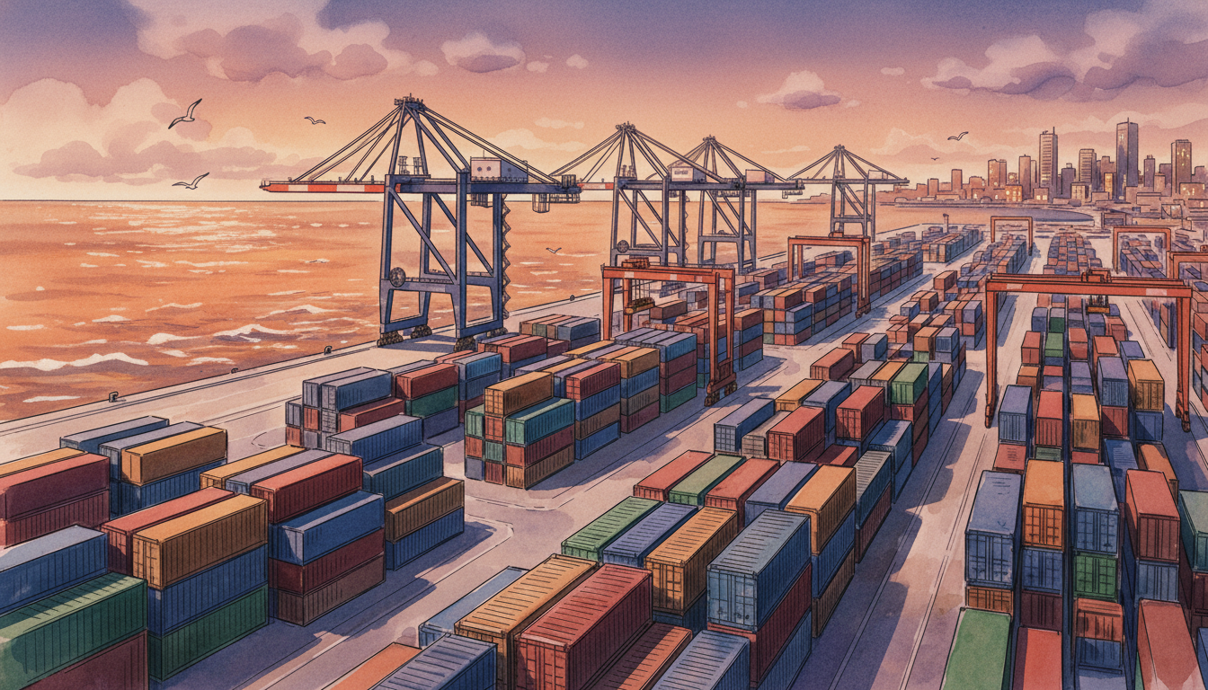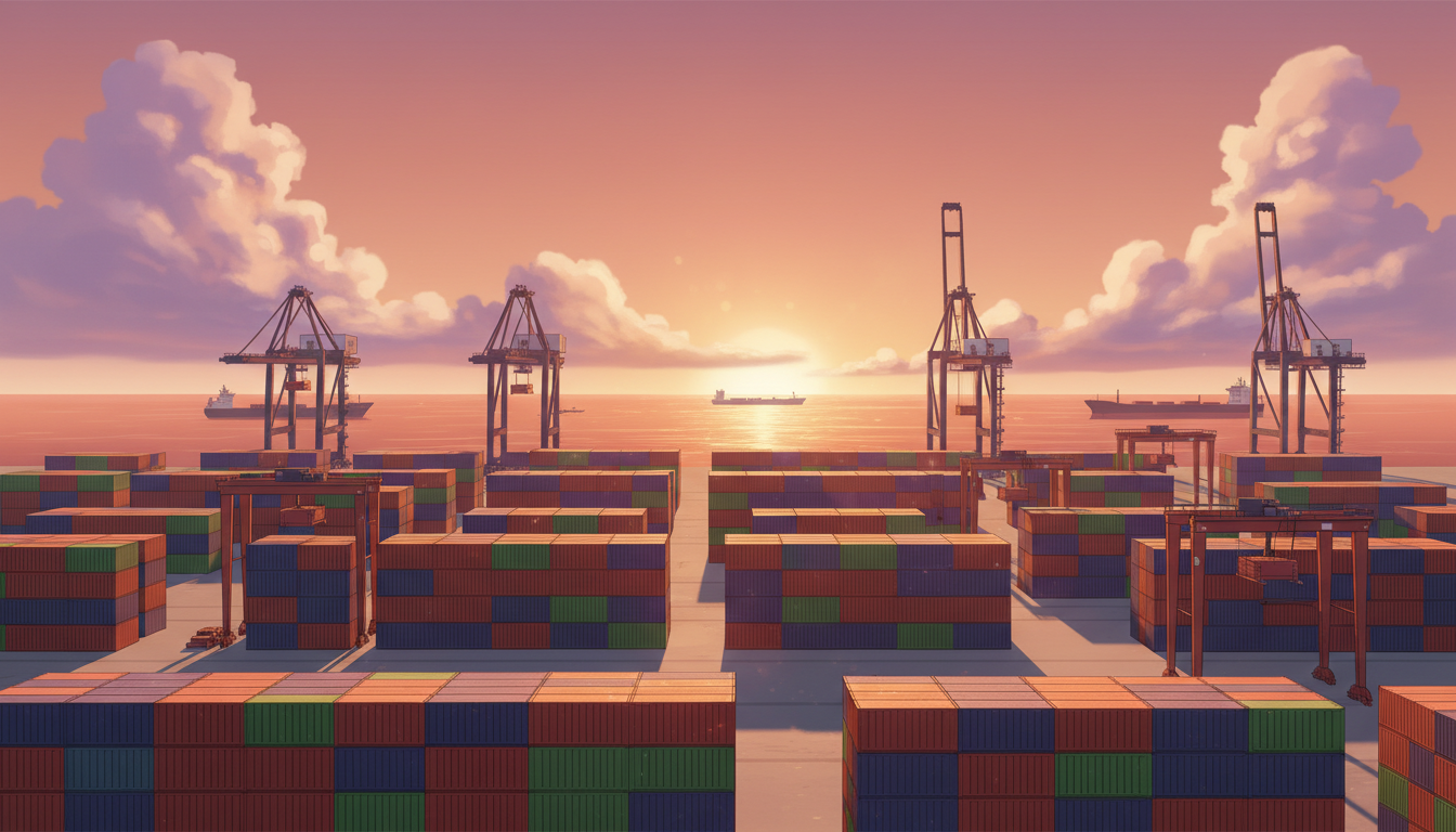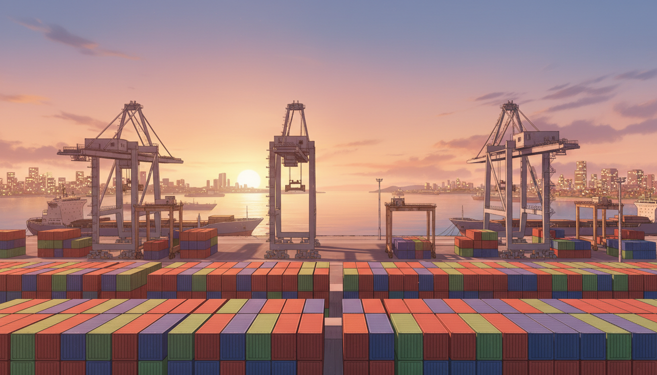 夕日に照らされるコンテナターミナルを描いた迫力ある背景素材です。