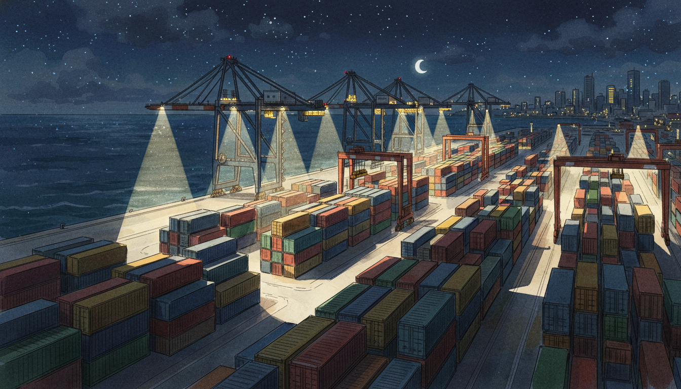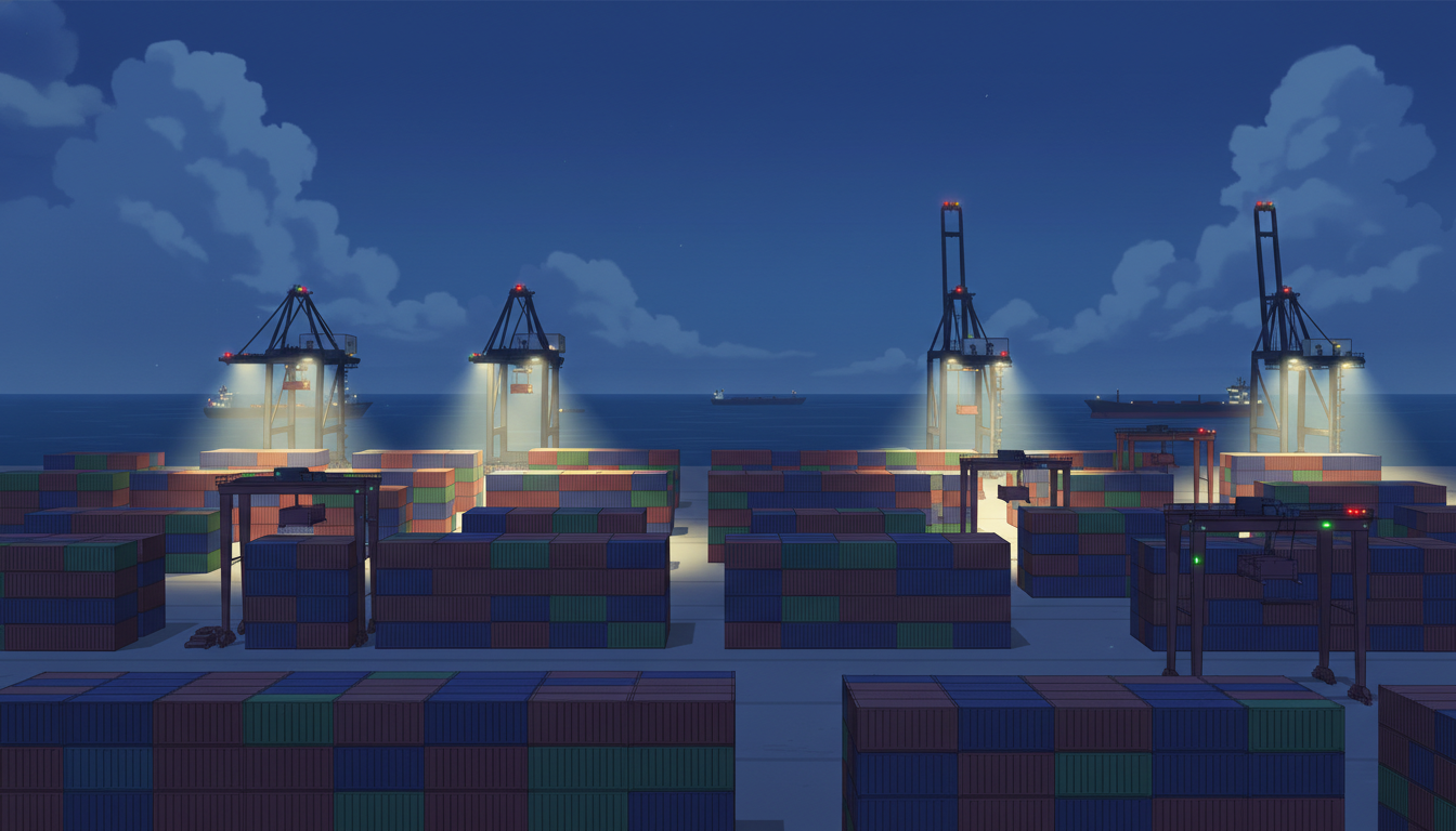 作業灯に照らされたコンテナとクレーンが並ぶ、リアルな夜の港湾背景素材です。