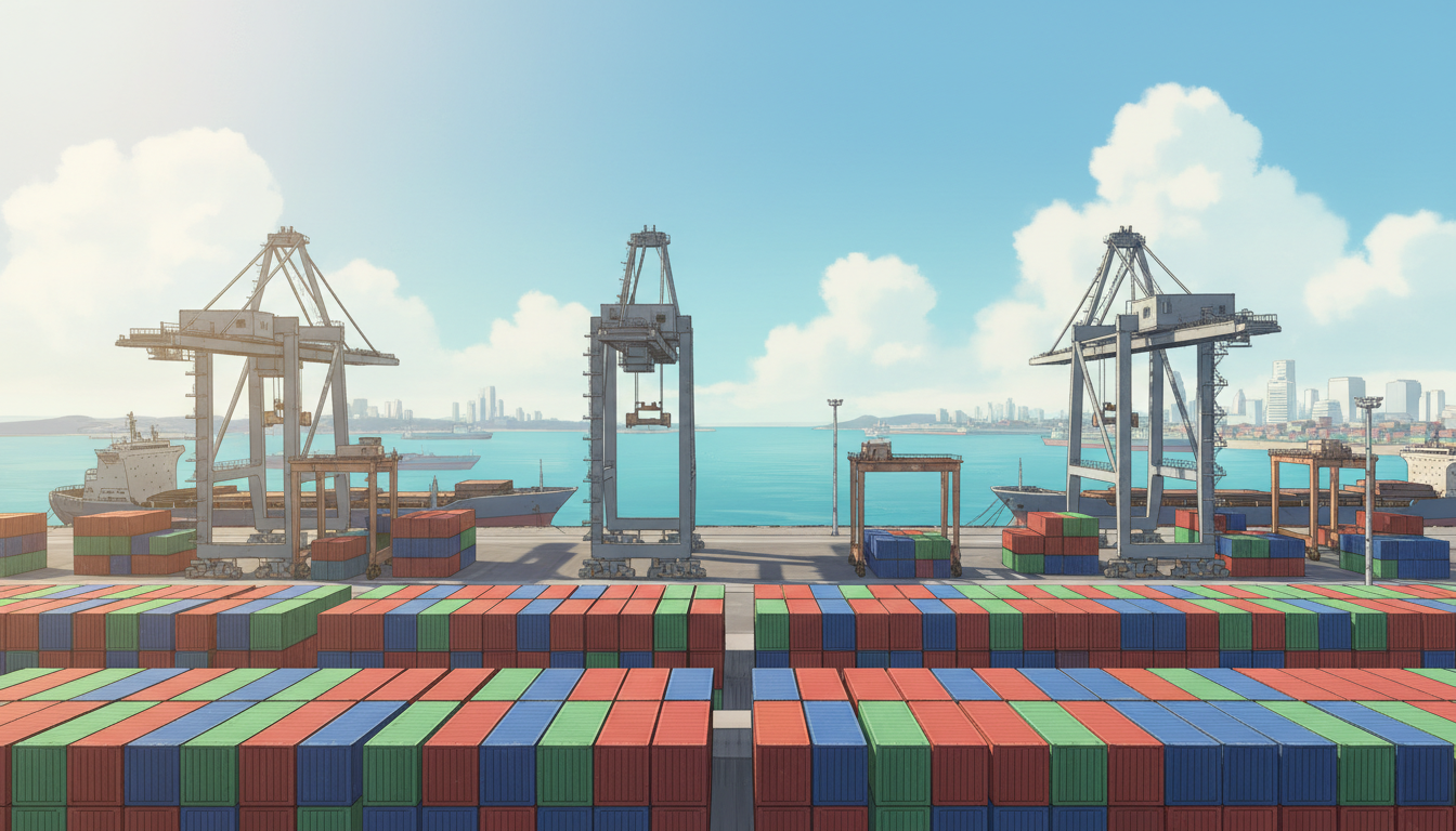晴天の港とコンテナクレーン|近代的港湾イラスト素材