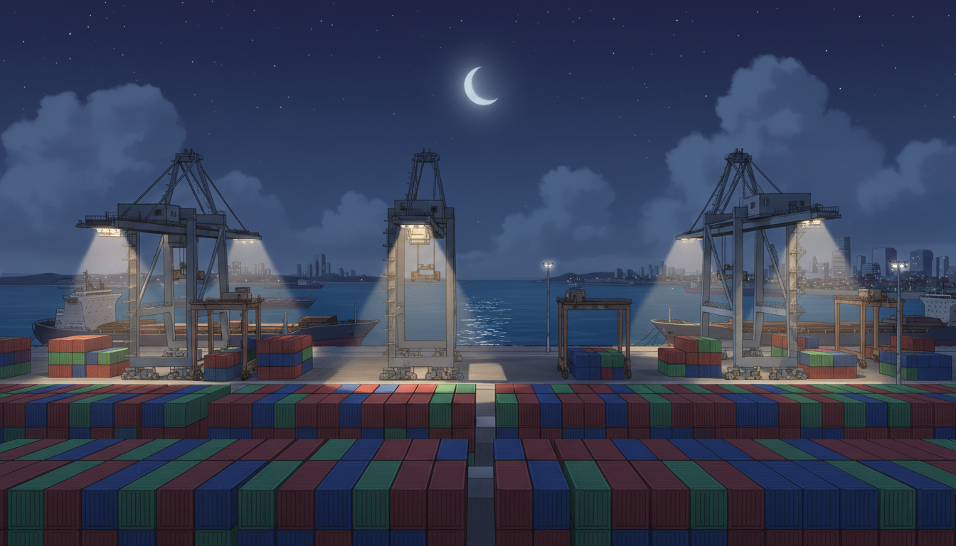 月夜のコンテナターミナルとクレーン|静謐な港湾ナイト背景素材