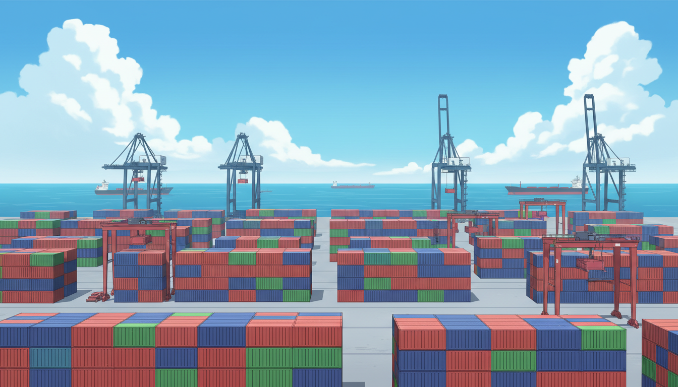 青空と海を背景に、整然と並ぶコンテナヤードを描いた背景素材です。