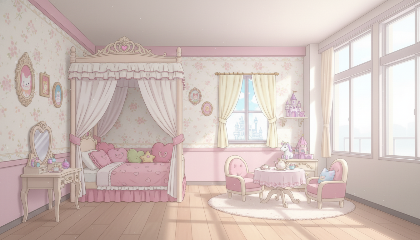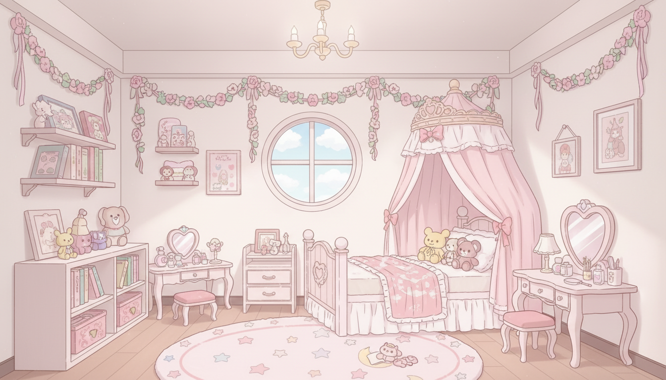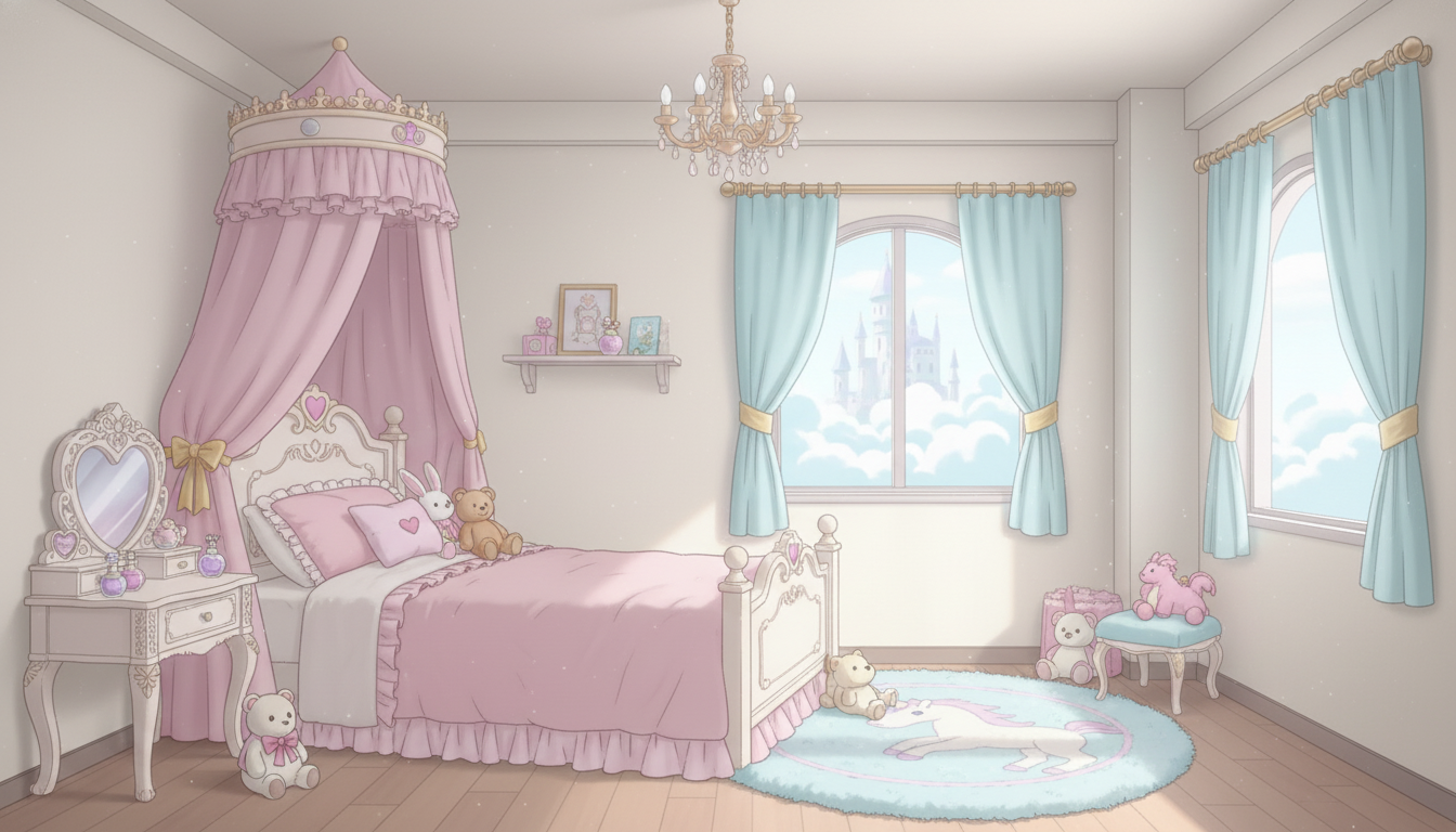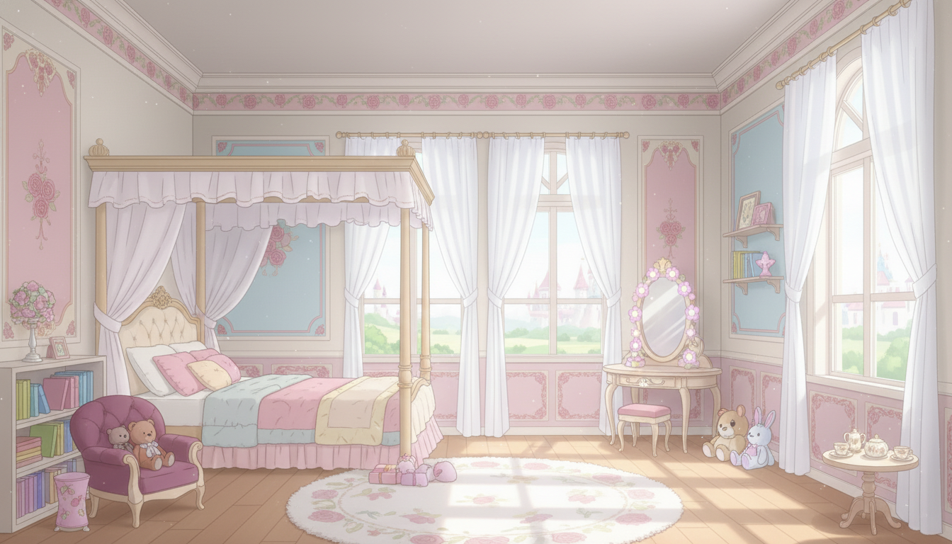 花のガーランドとぬいぐるみが彩る、夢見る少女のための優しい姫部屋背景。