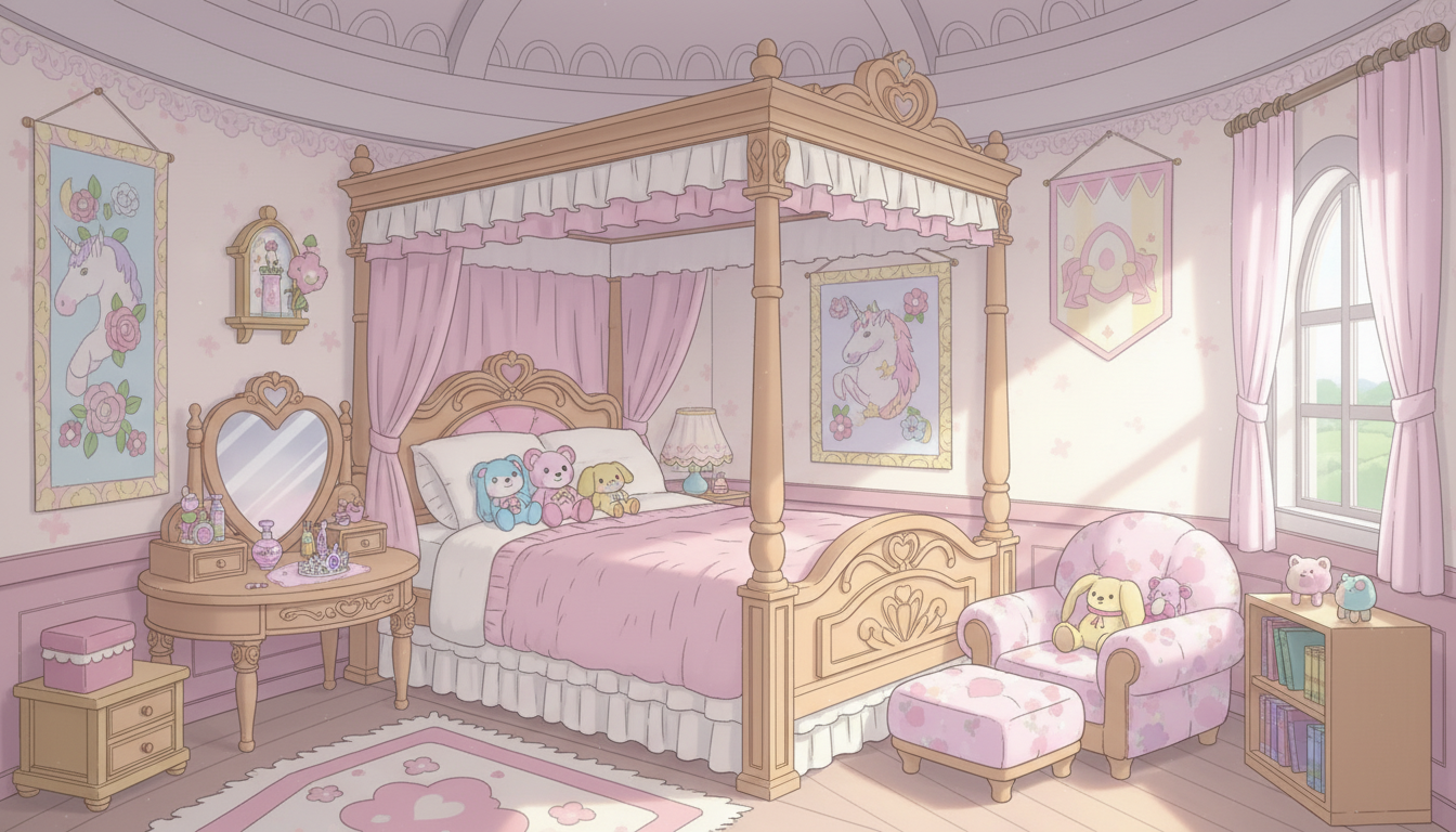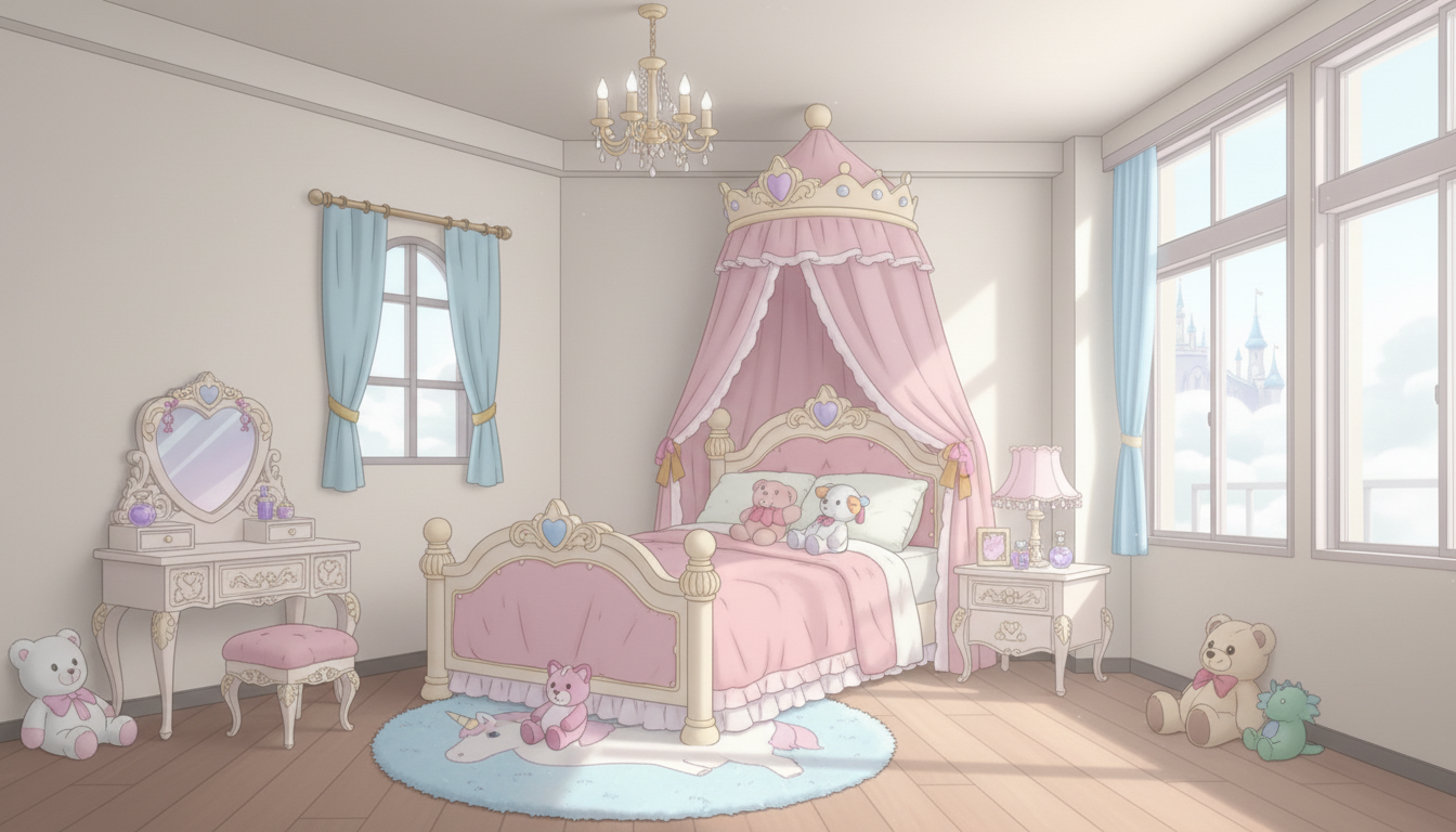 ピンクの天蓋と可愛いぬいぐるみが並ぶ、少女の夢が詰まったロマンチックな部屋。