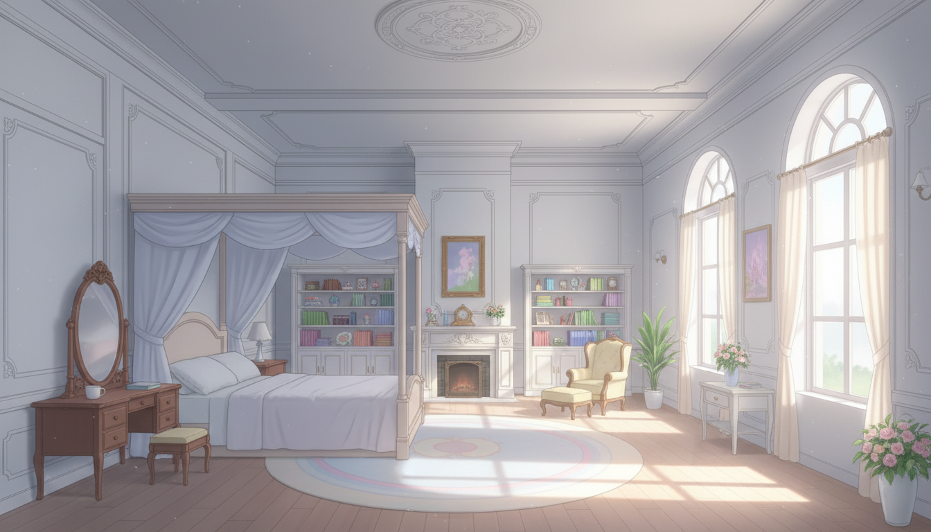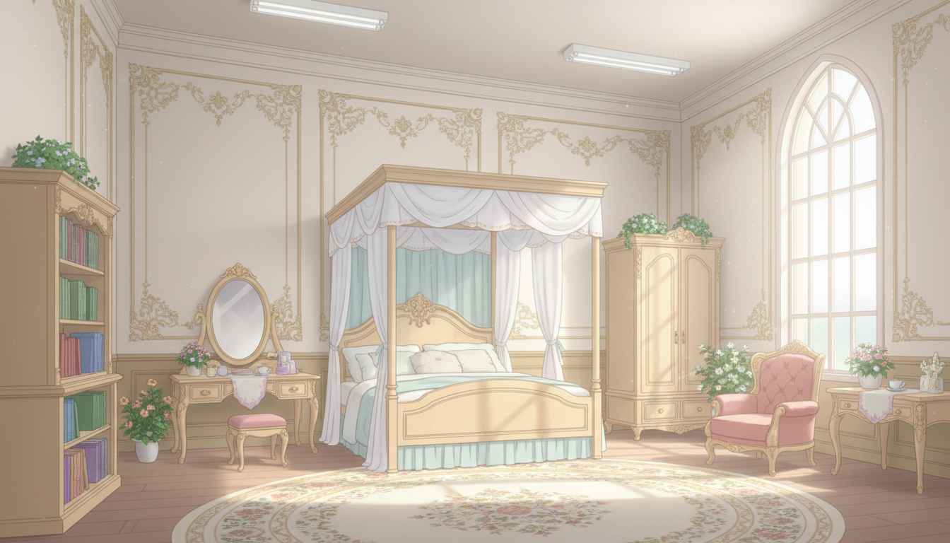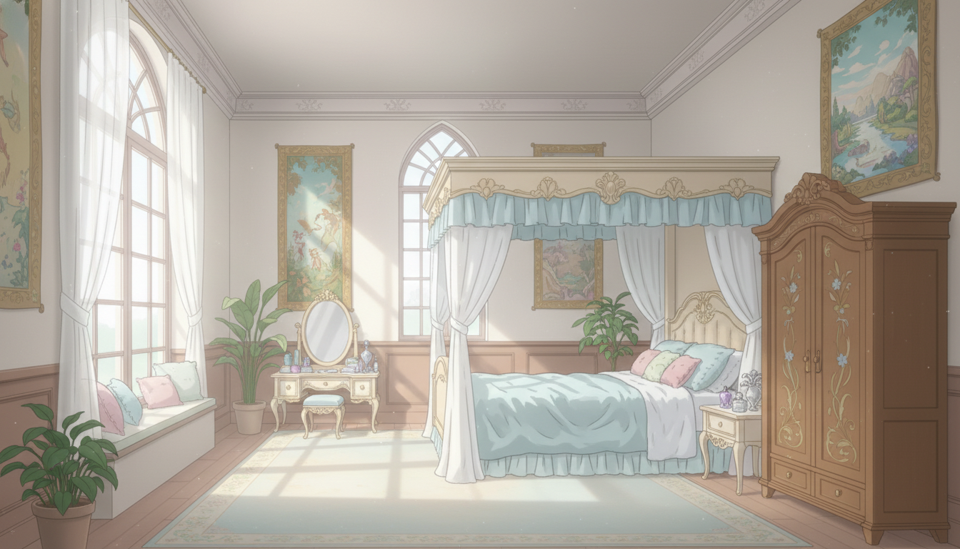 花の装飾と優しい光があふれる、おとぎ話のように可憐な姫の部屋背景。