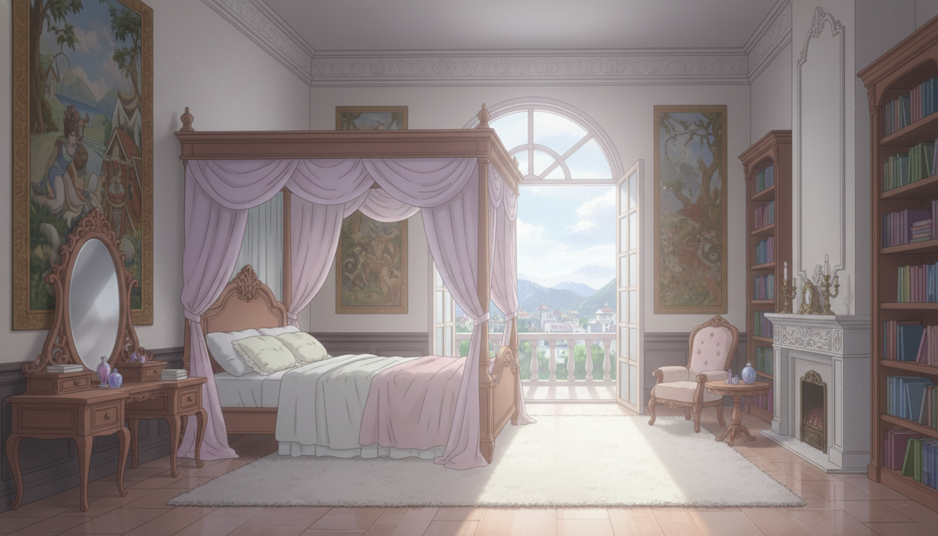プリンセスの寝室の背景イラストを無料提供。16:9の横長アングルで様々な作品に背景イラストとして活用しやすい!漫画・Webtoonやゲーム背景として商用利用・トレースもOK!