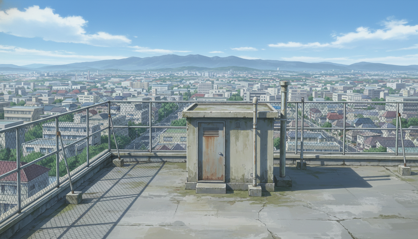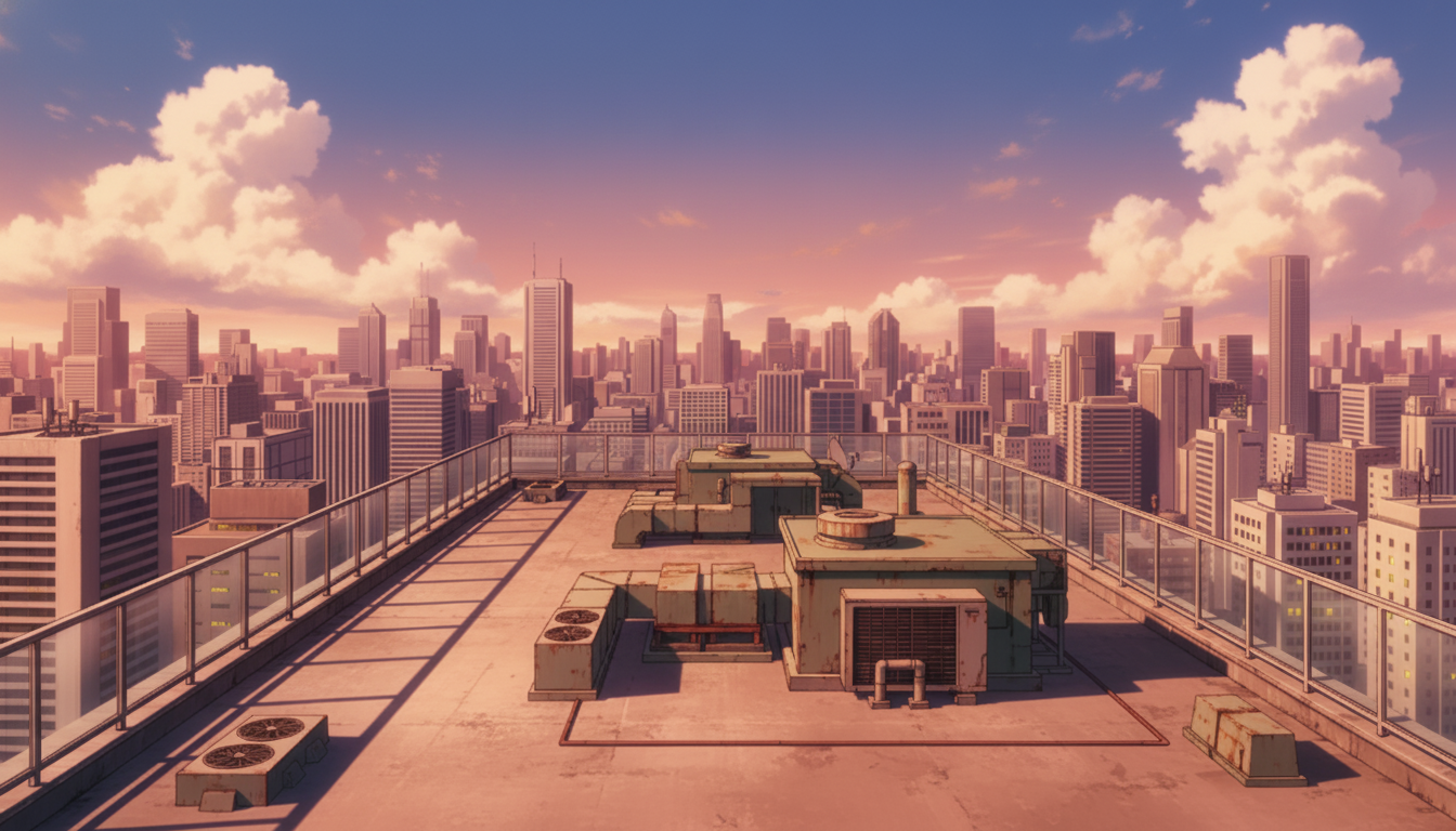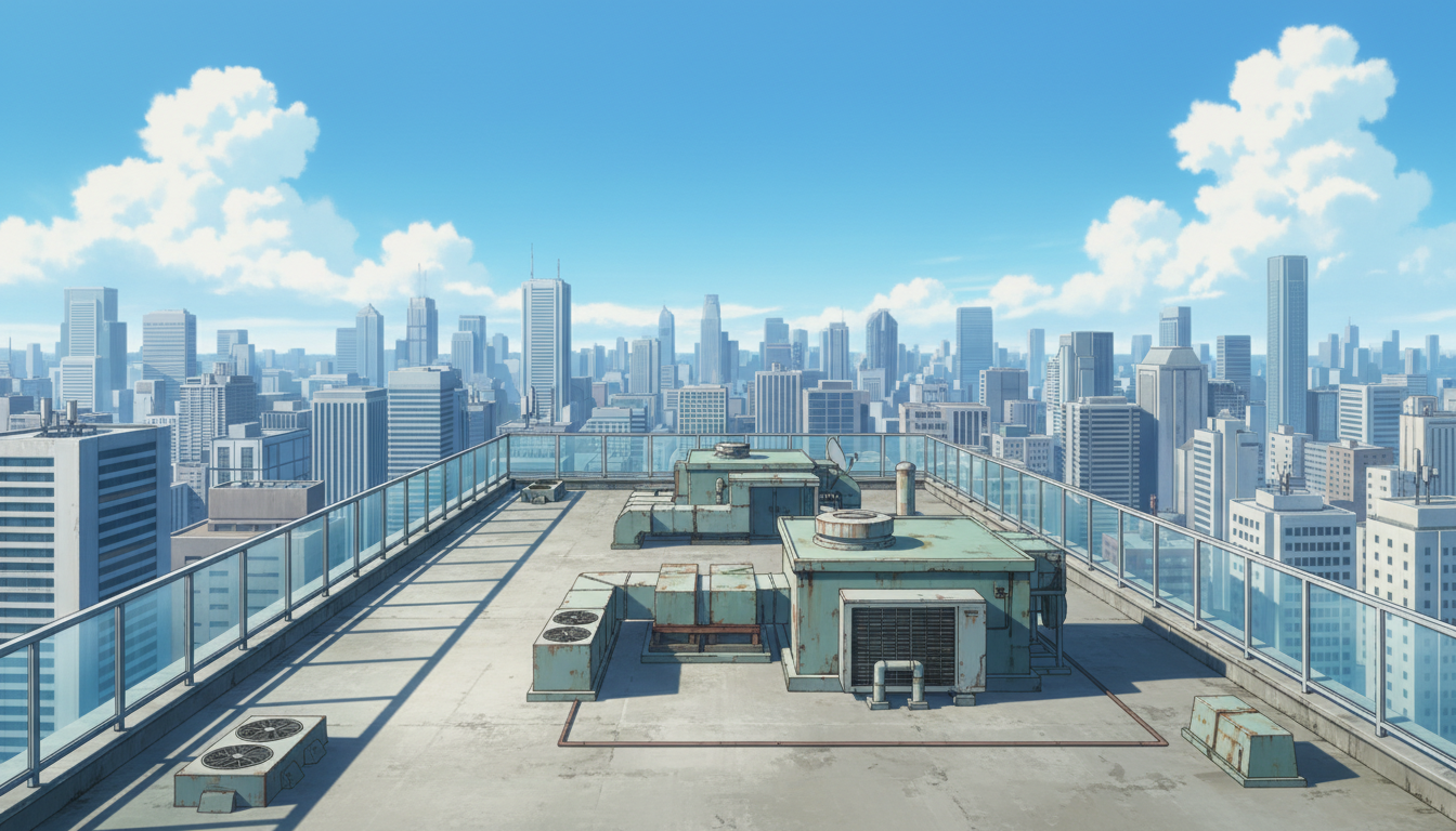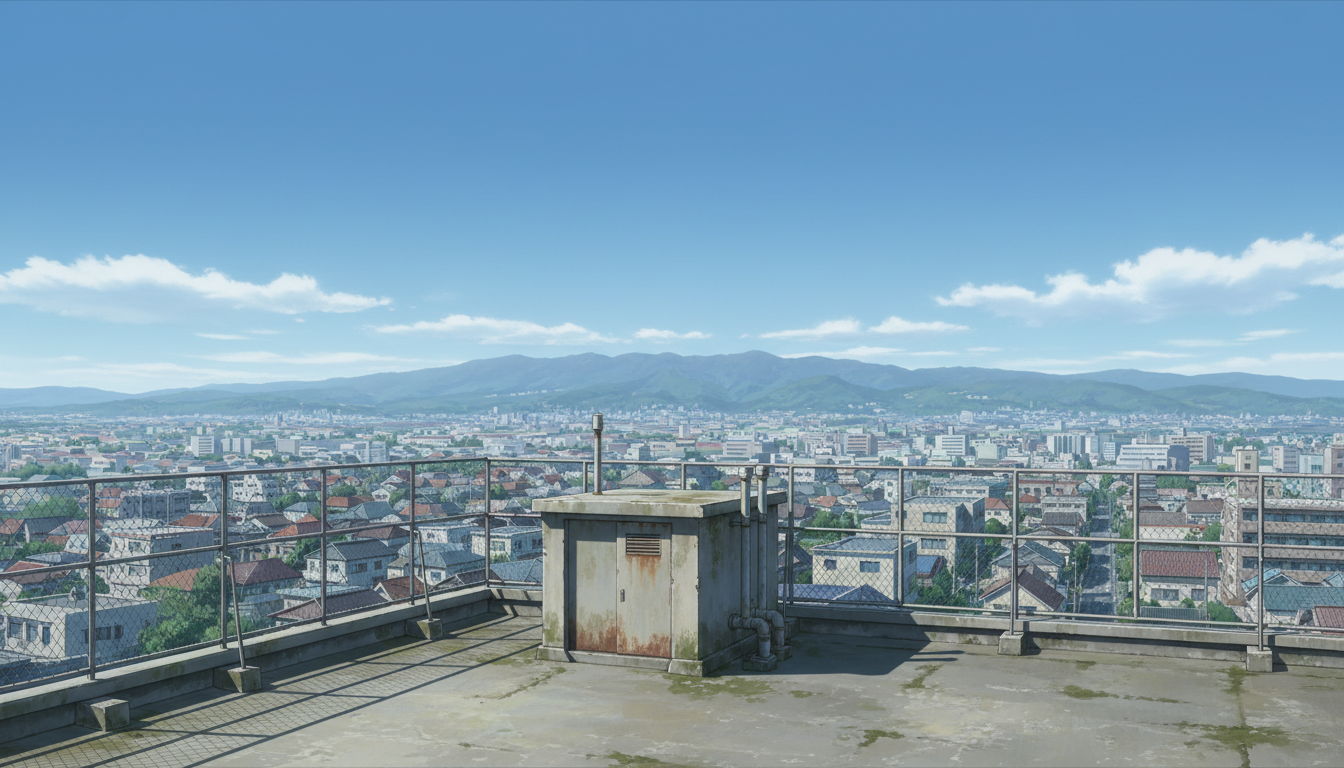 屋上の背景イラスト素材を無料配布。16:9の横長構図でPC向け作品に使いやすい背景イラストです。漫画・Webtoonやゲーム背景として商用・トレース利用もOK!