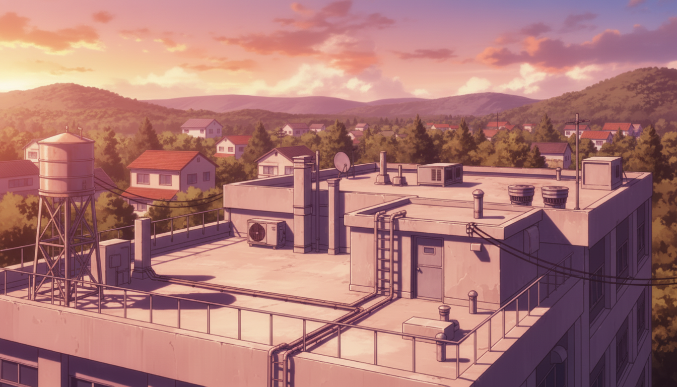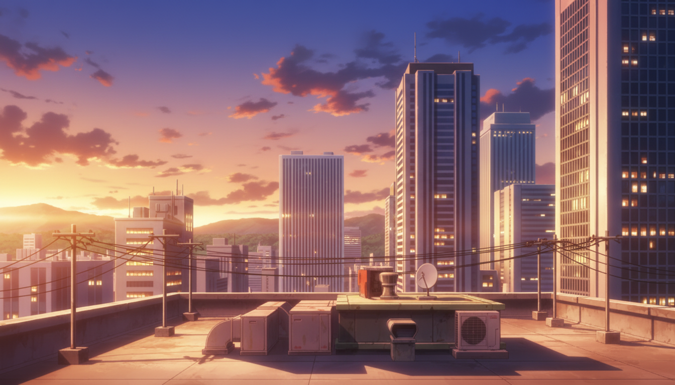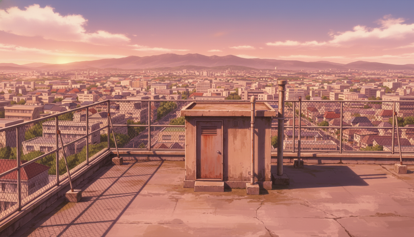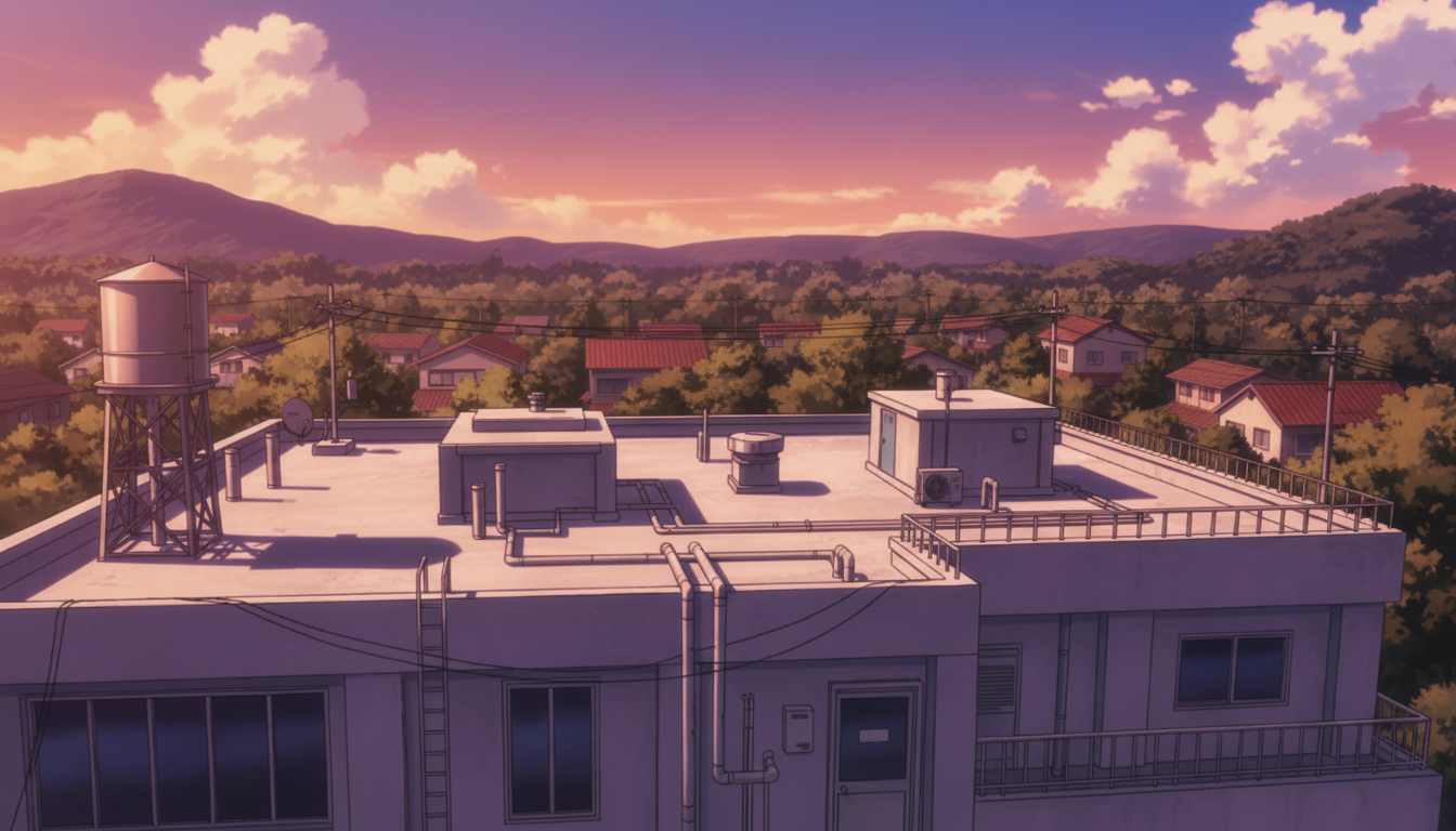 屋上の背景イラスト素材を無料配布。16:9の横長構図でPC向け作品に使いやすい背景イラストです。漫画・Webtoonやゲーム背景として商用・トレース利用もOK!