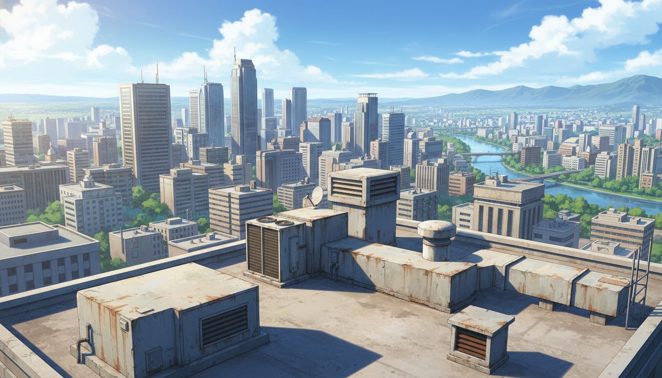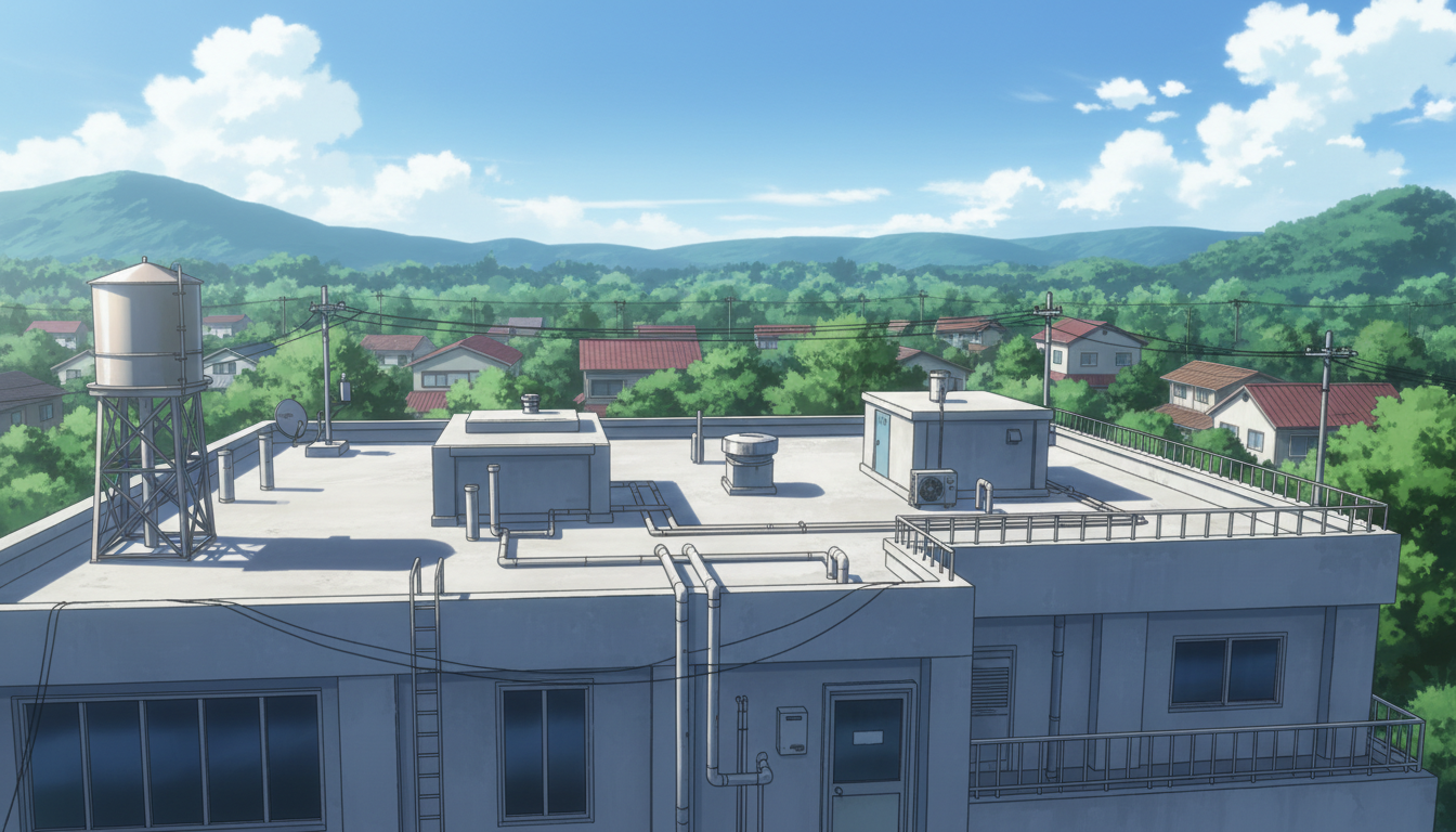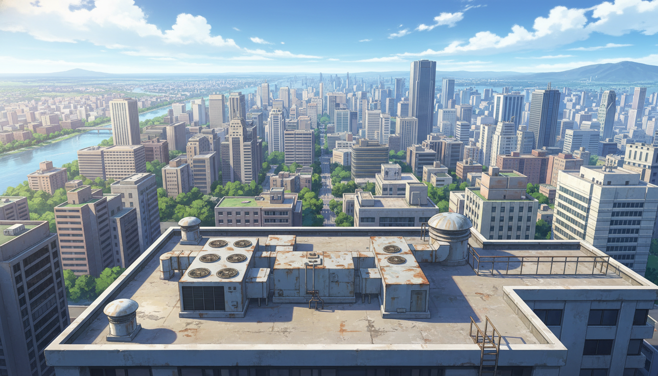 見晴らしの良い屋上設備と広い空が映え、日常から事件前夜まで使える背景です。