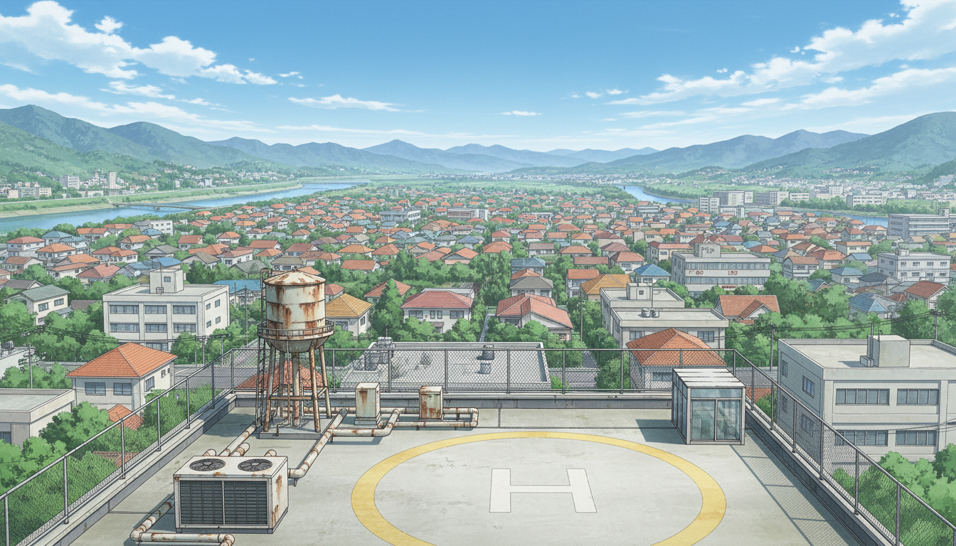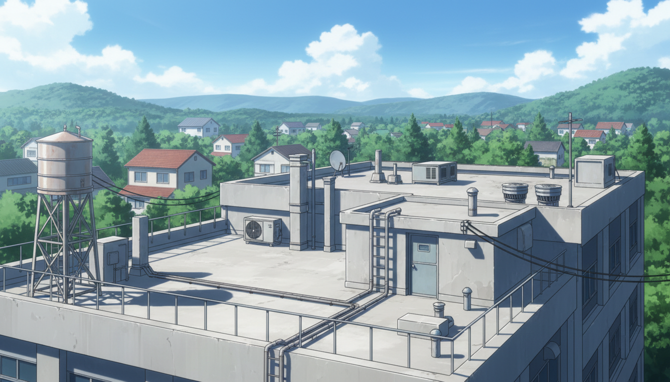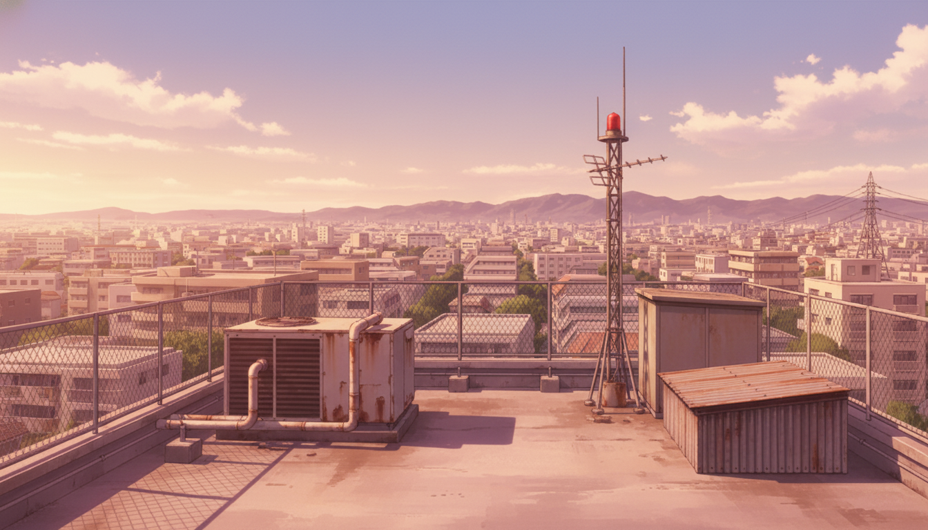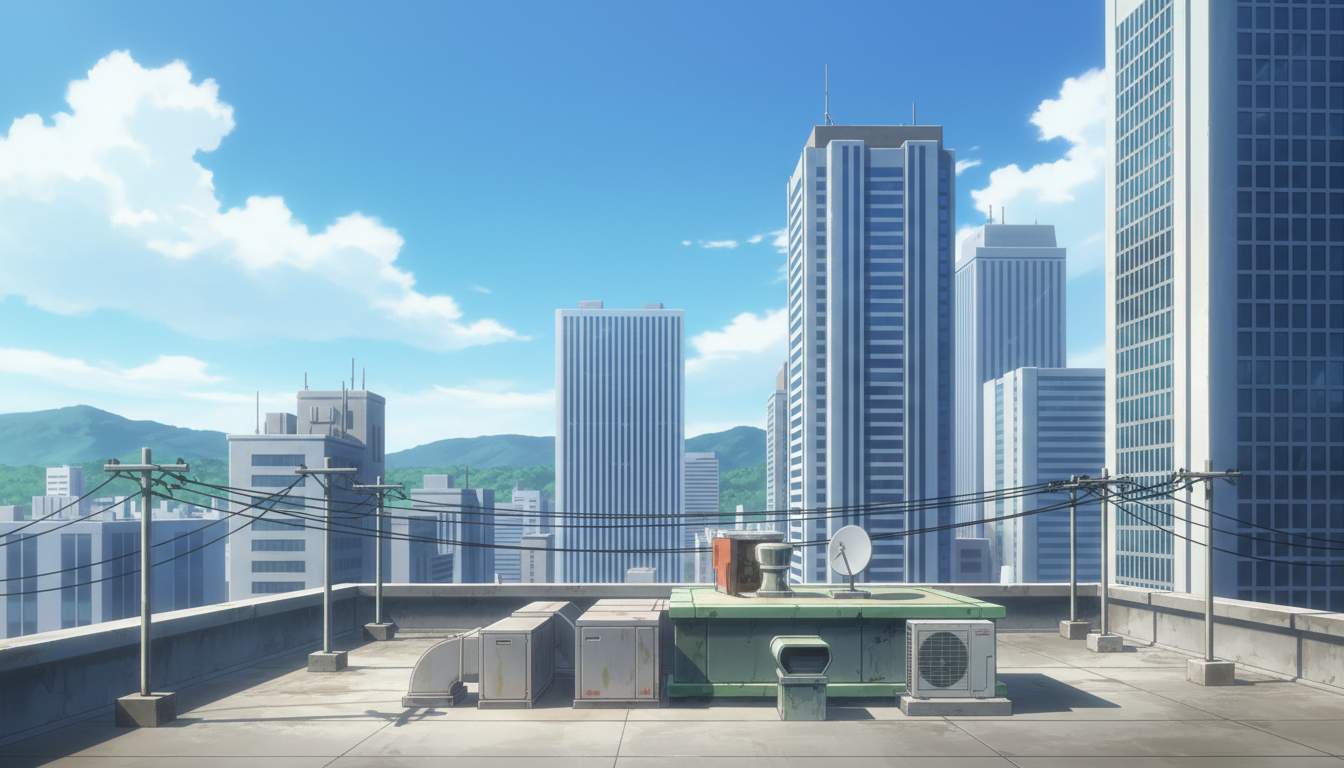 見晴らしの良い屋上設備と広い空が映え、日常から事件前夜まで使える背景です。