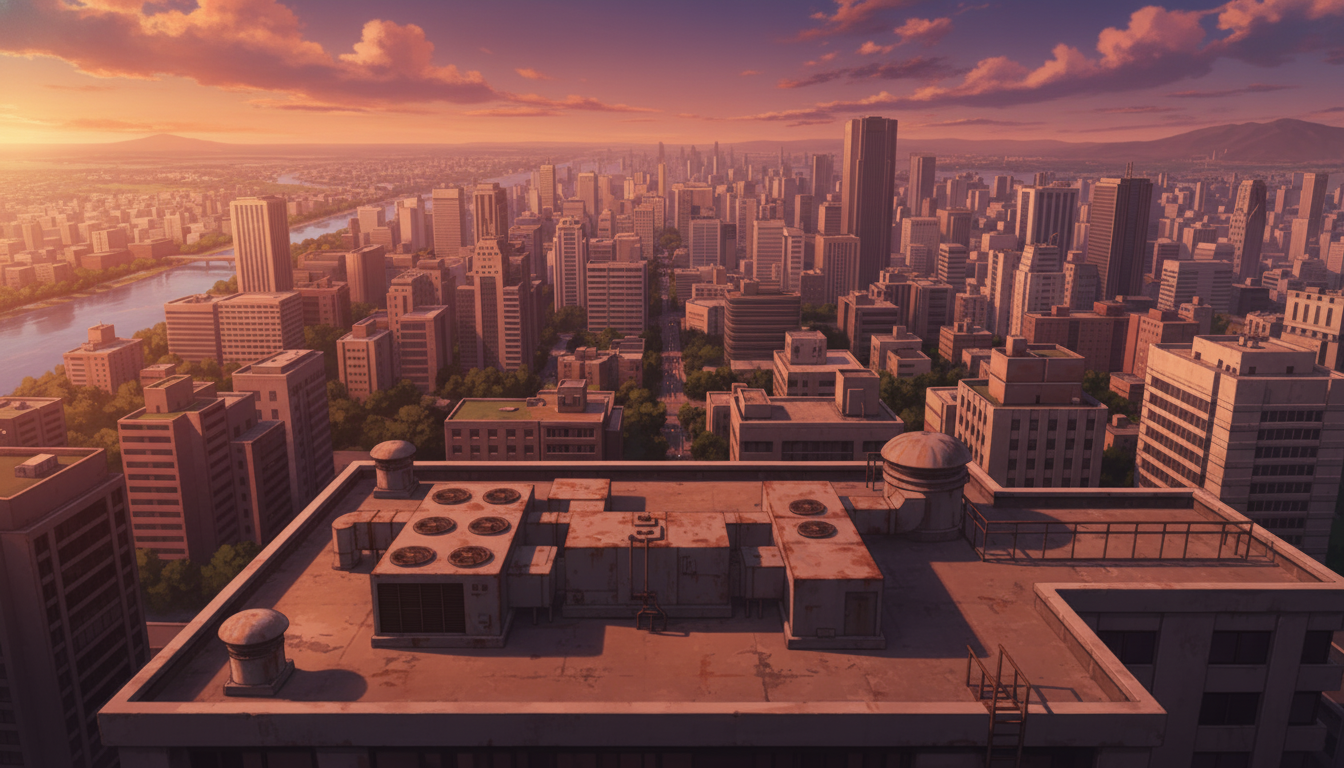 広い空と街並みを一望でき、落ち着いた日常シーンを作れる屋上背景です。