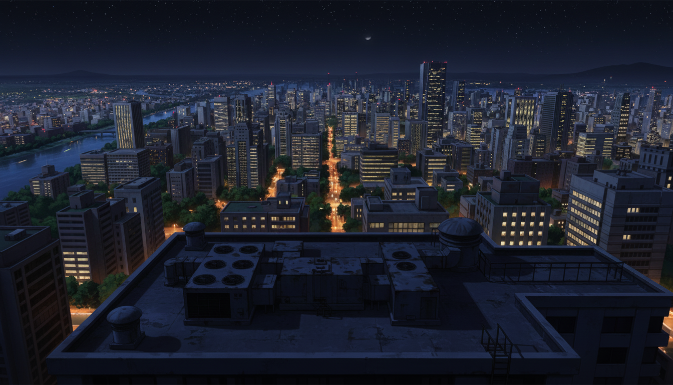 星降る夜の高層ビル屋上|都会の夜景と静寂・ナイトシーン