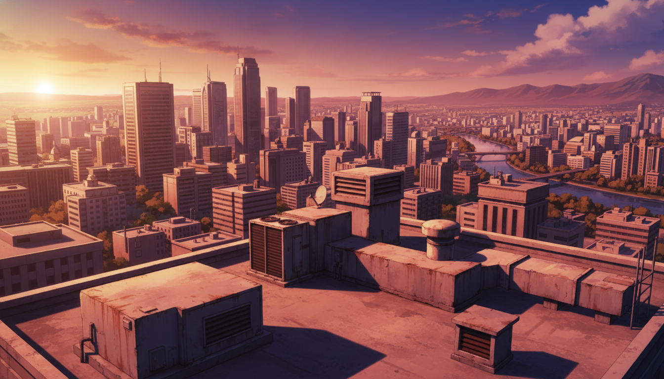 温かな夕日が屋上設備と街並みを染め、待ち合わせや余韻のある場面に合う背景です。