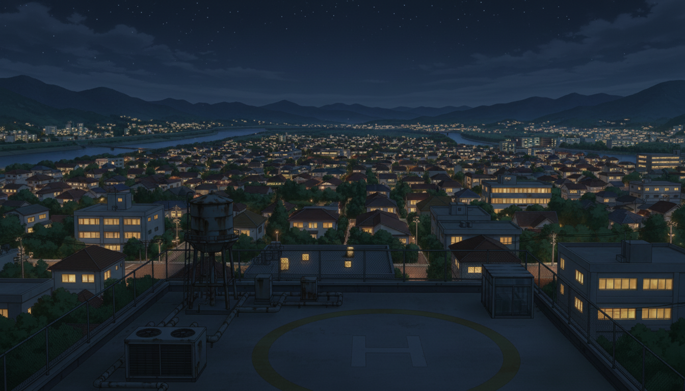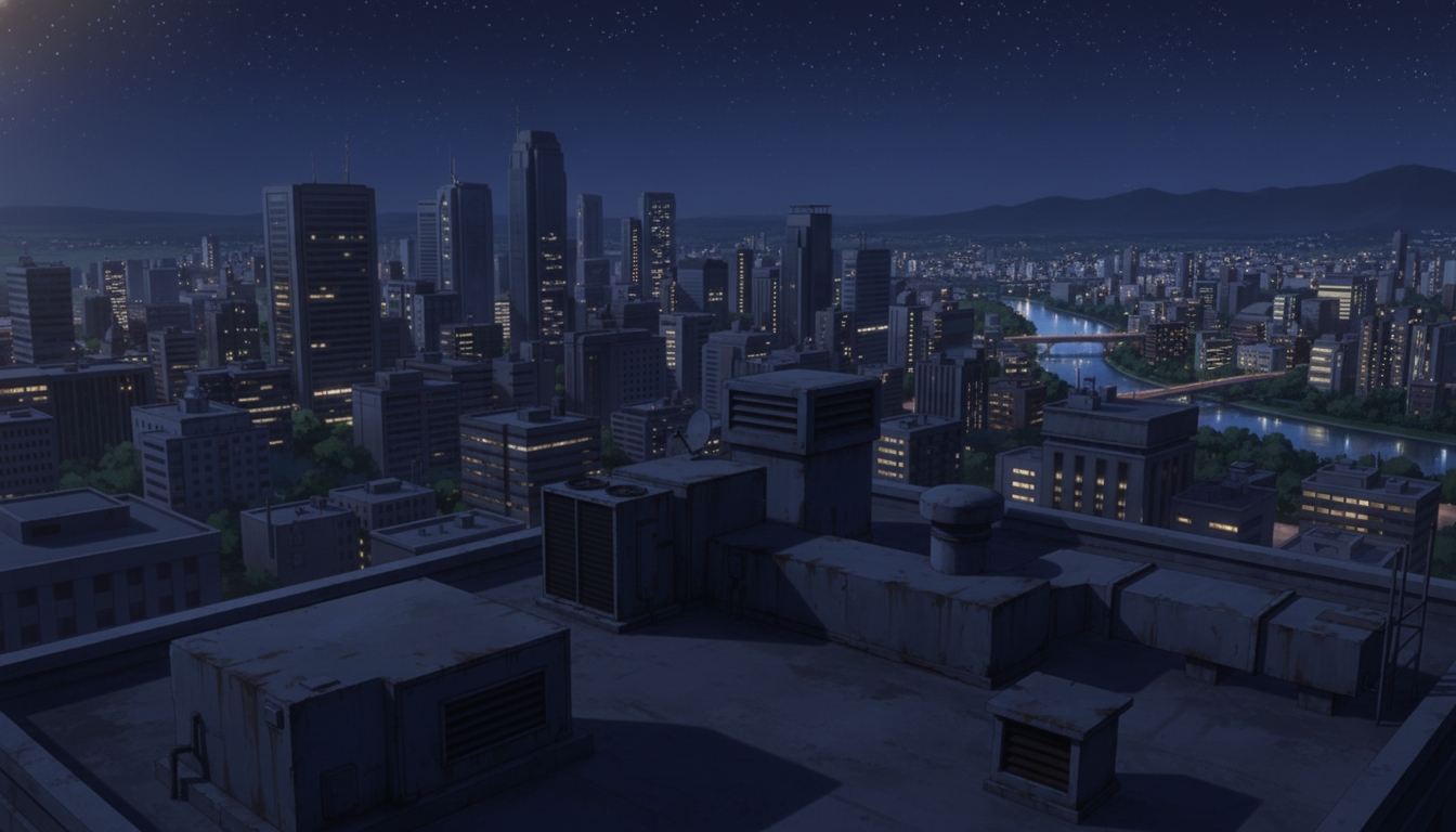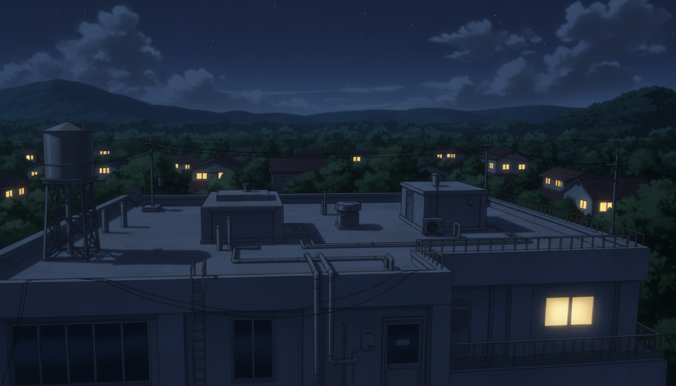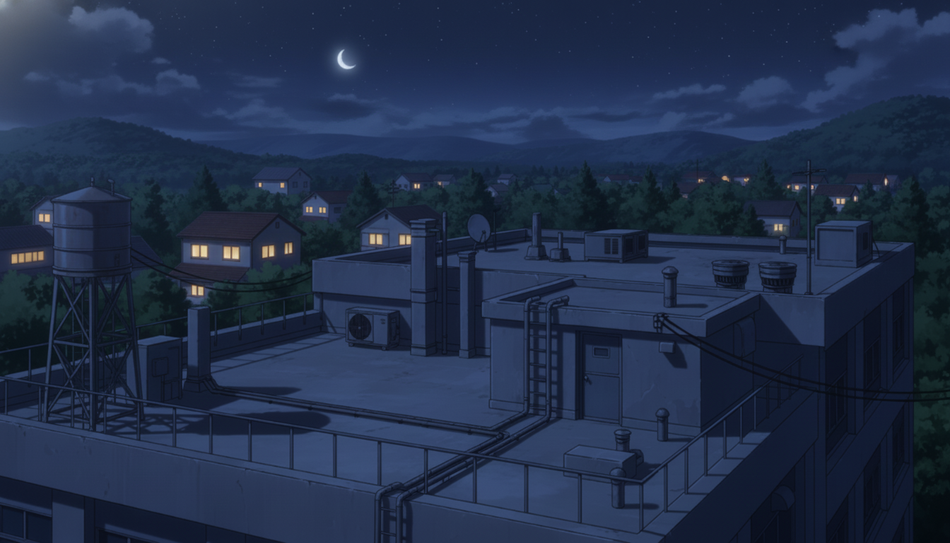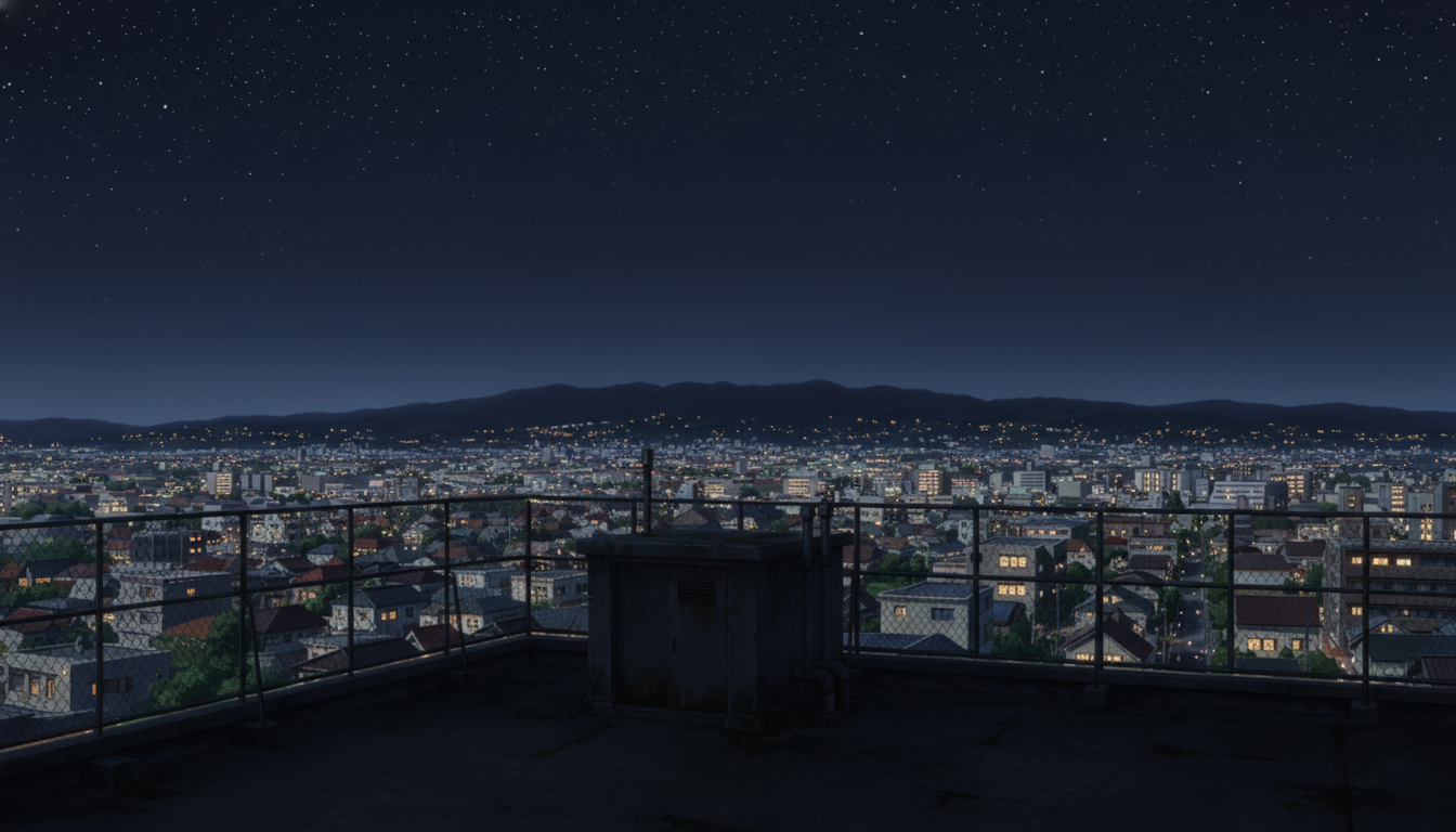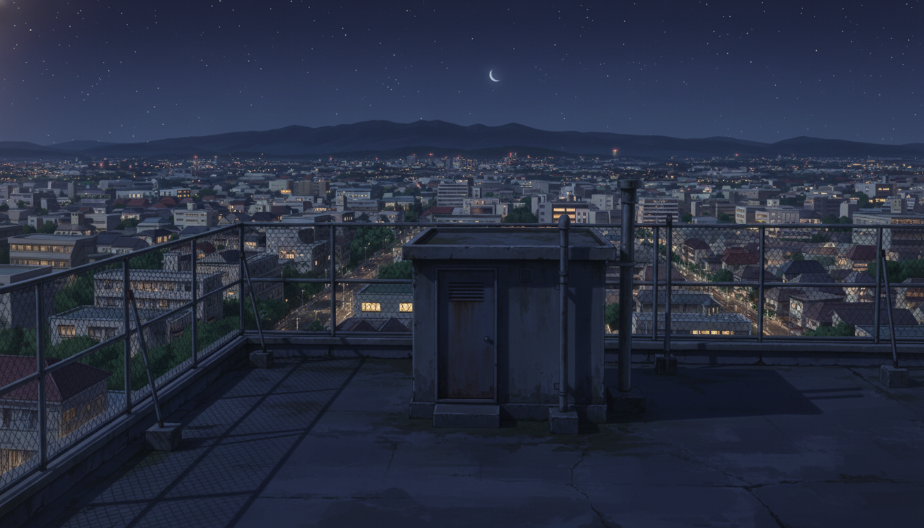 夜風を感じる静かな屋上で、秘密の待ち合わせや余韻シーンに使える背景です。