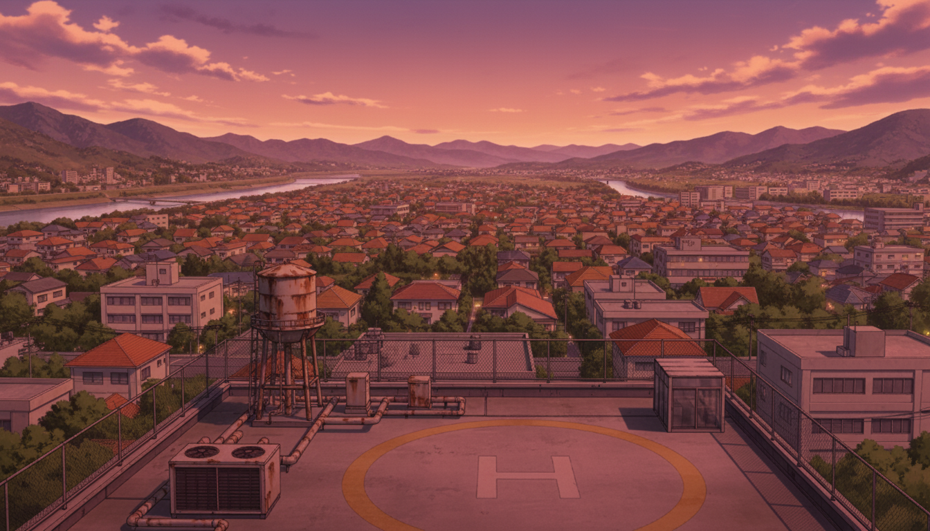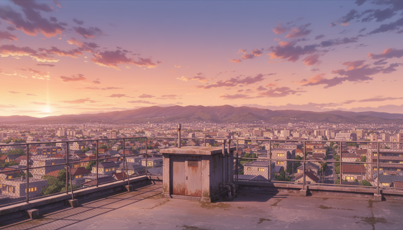 沈む夕日が屋上と山々を照らし、放課後の余韻を演出する背景です。