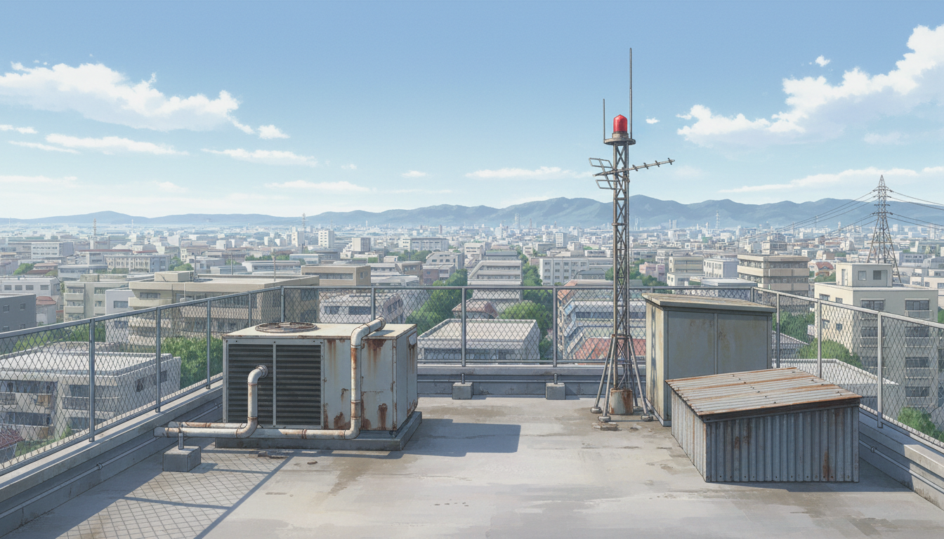 青空の通信塔屋上|赤色灯と金網フェンスの街並み・昼
