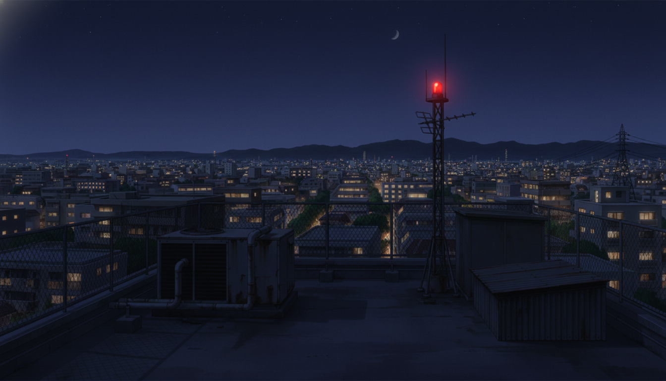 深夜の通信塔屋上|赤色灯と遠景の夜景・見張りシーン
