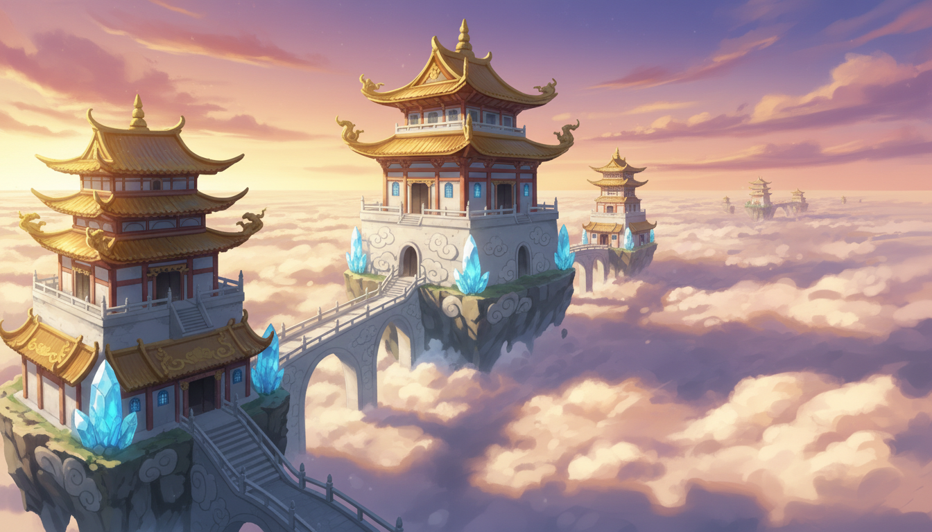 雲の上に点在する神殿と回廊を描いた、壮大で幻想的な天空神殿の背景素材です。