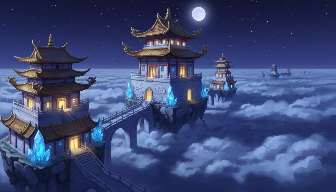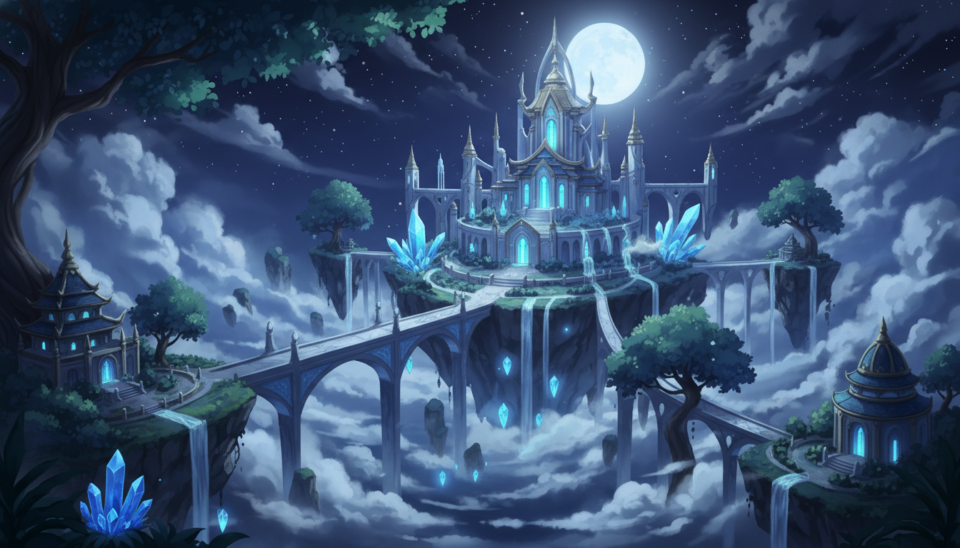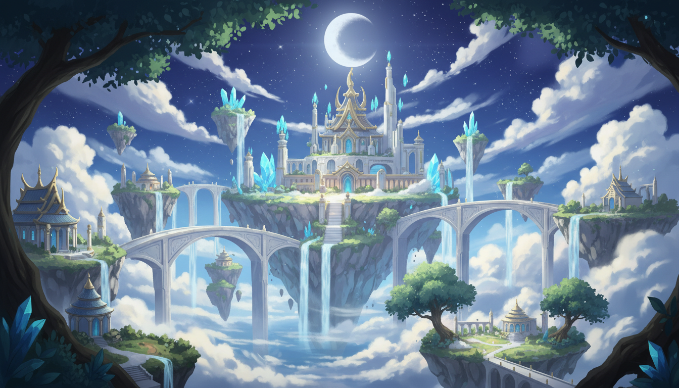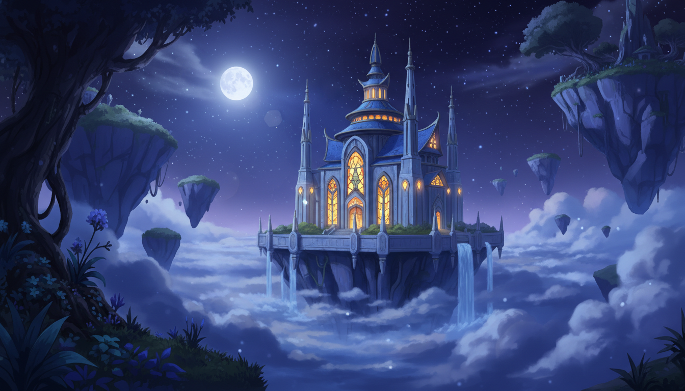 星と月に照らされた天空神殿が浮かぶ、幻想的で静かな夜の背景素材です。