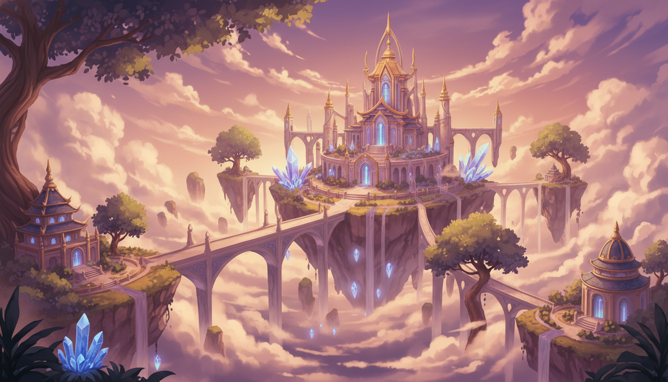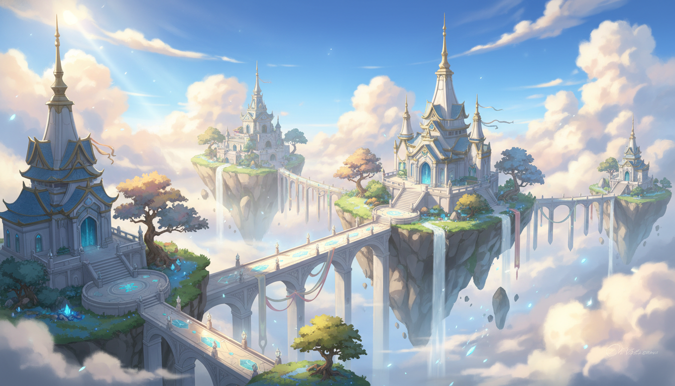 神殿をつなぐ回廊と浮島が印象的な、物語性を感じる天空神殿背景素材です。