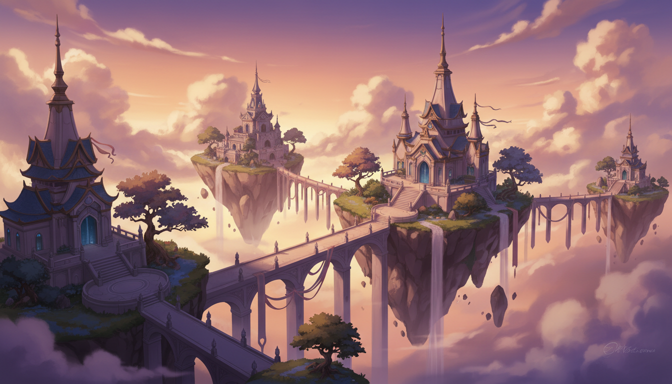 黄昏の天空神殿と浮遊岩群|幻想的スケール背景素材