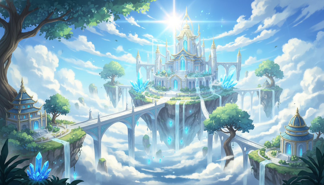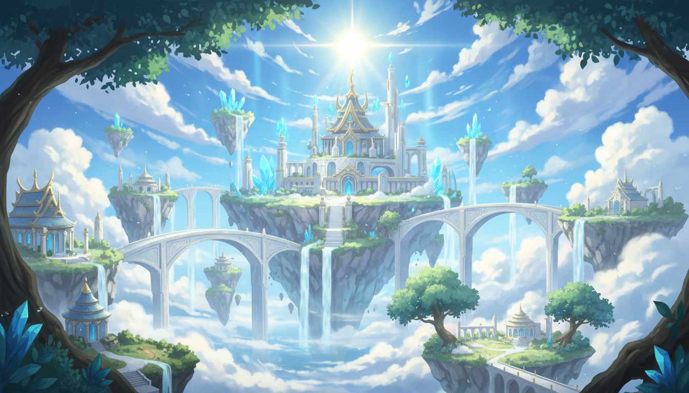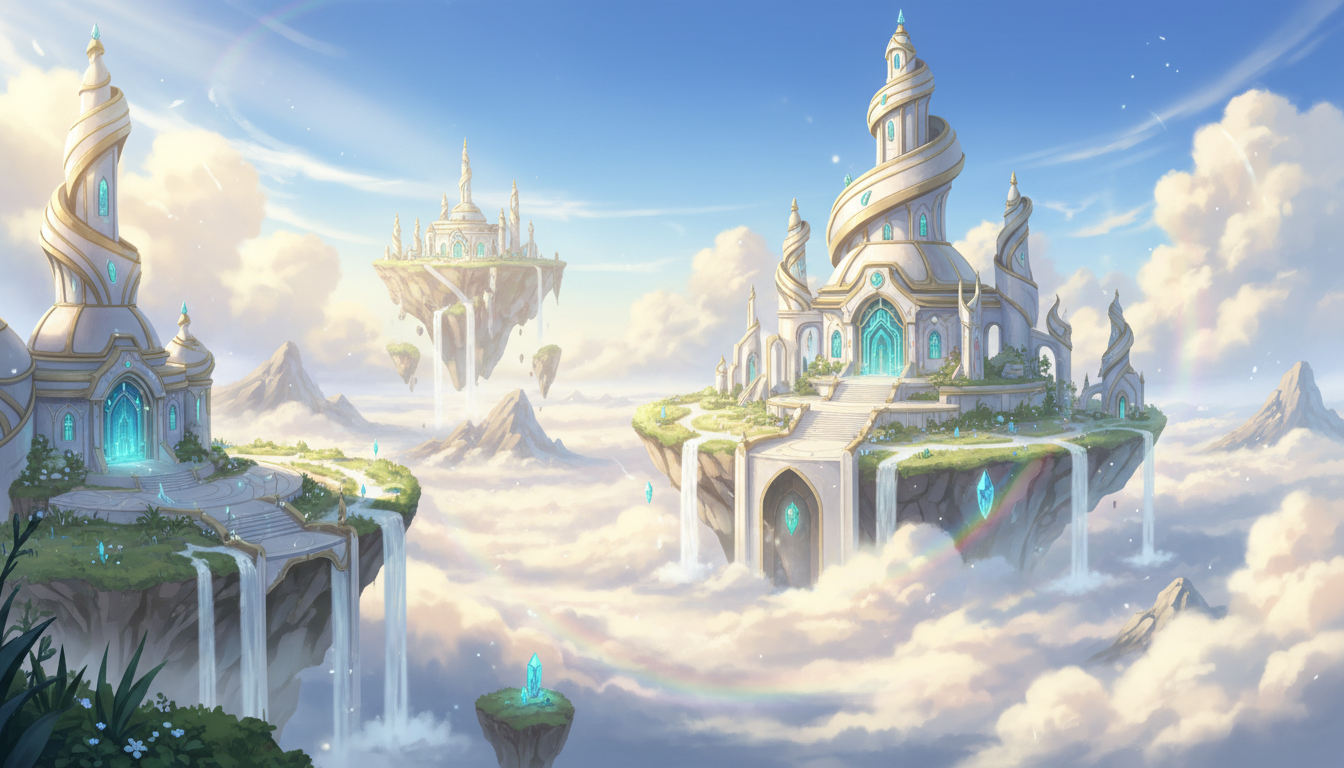 複数の神殿と浮遊島が連なる、天空世界全体を俯瞰した背景素材です。