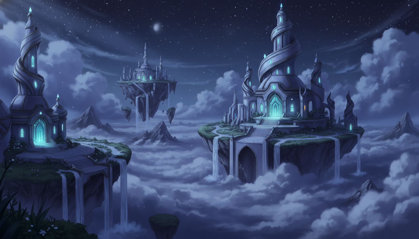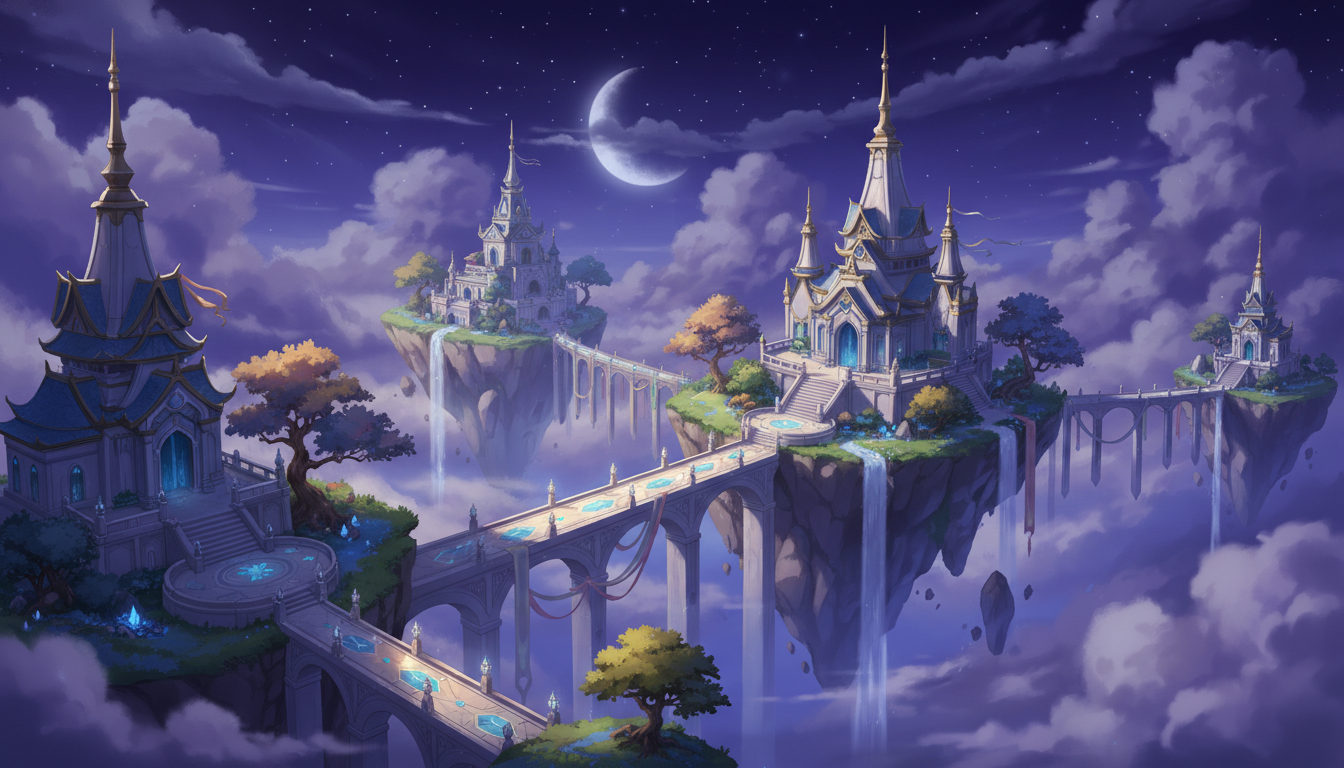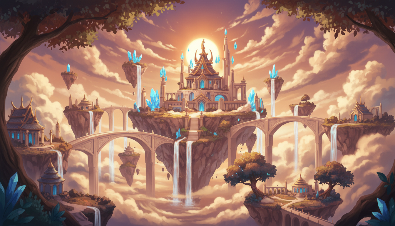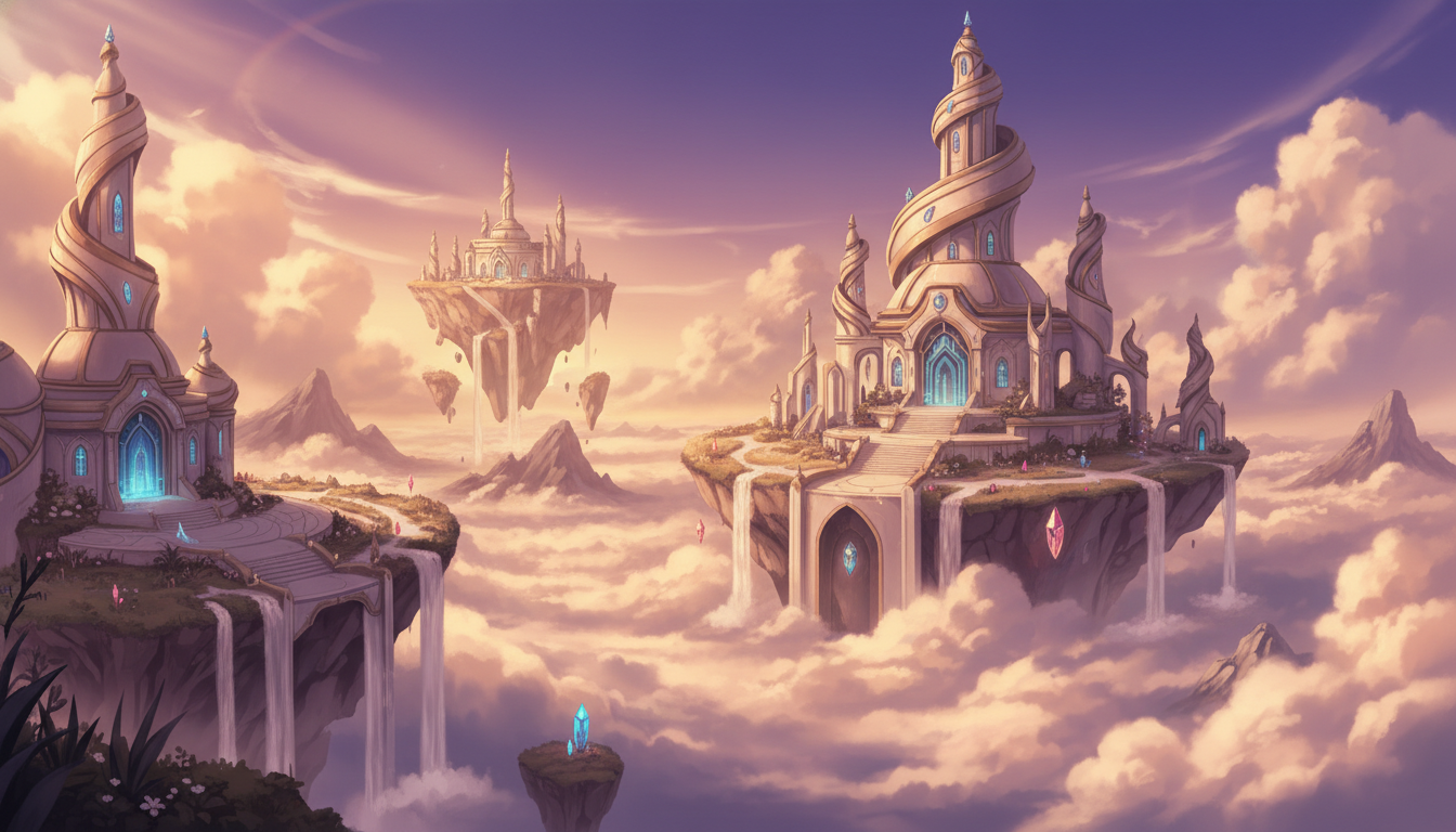 複数の神殿と浮遊島が連なる、天空世界全体を俯瞰した背景素材です。
