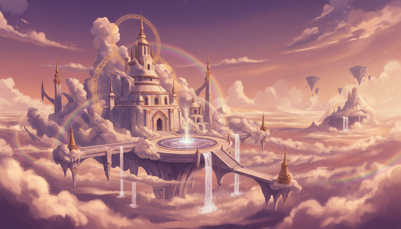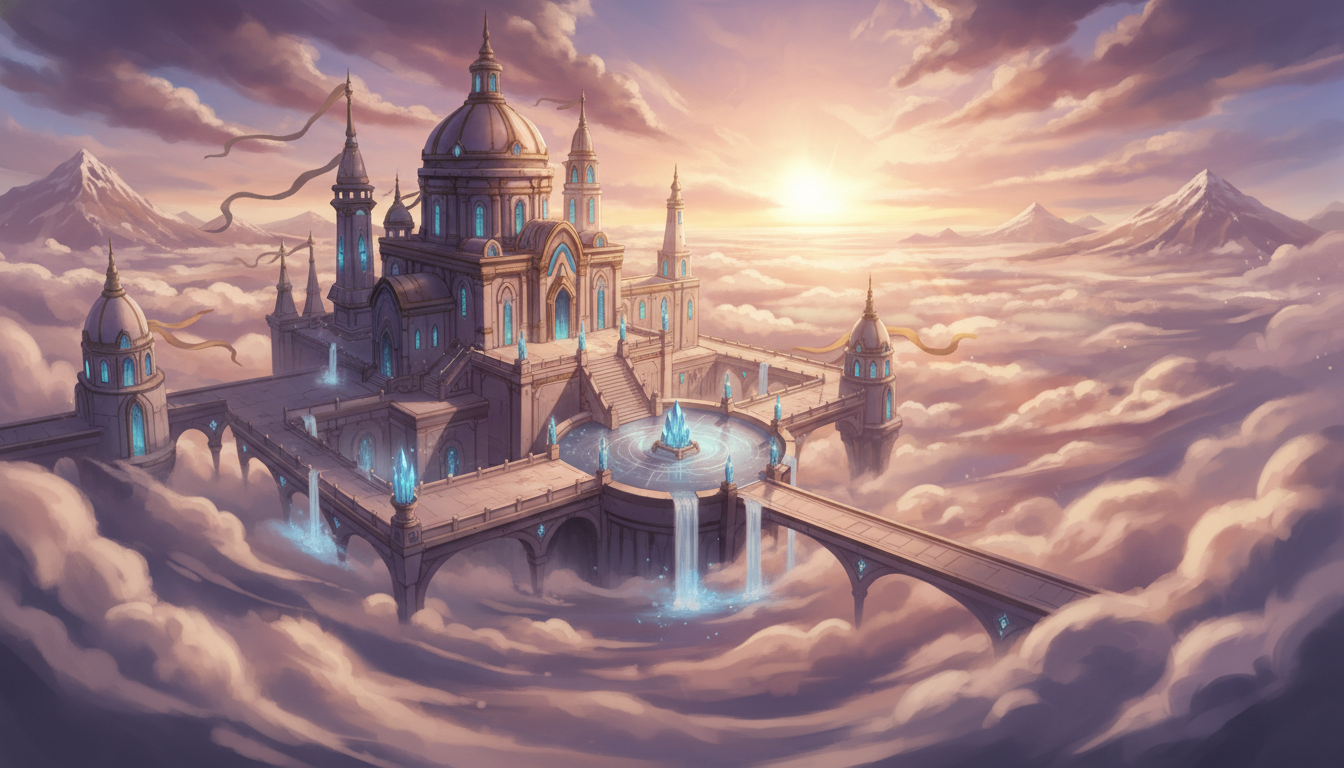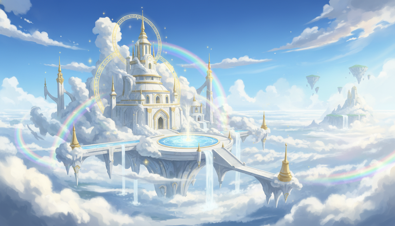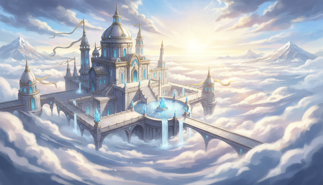 雲上に広がる天空神殿都市|壮大ファンタジー背景素材