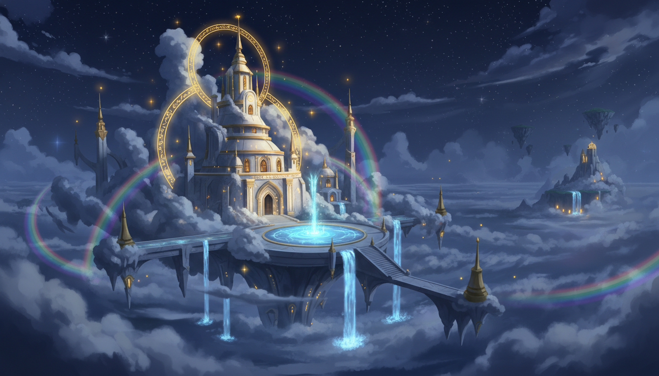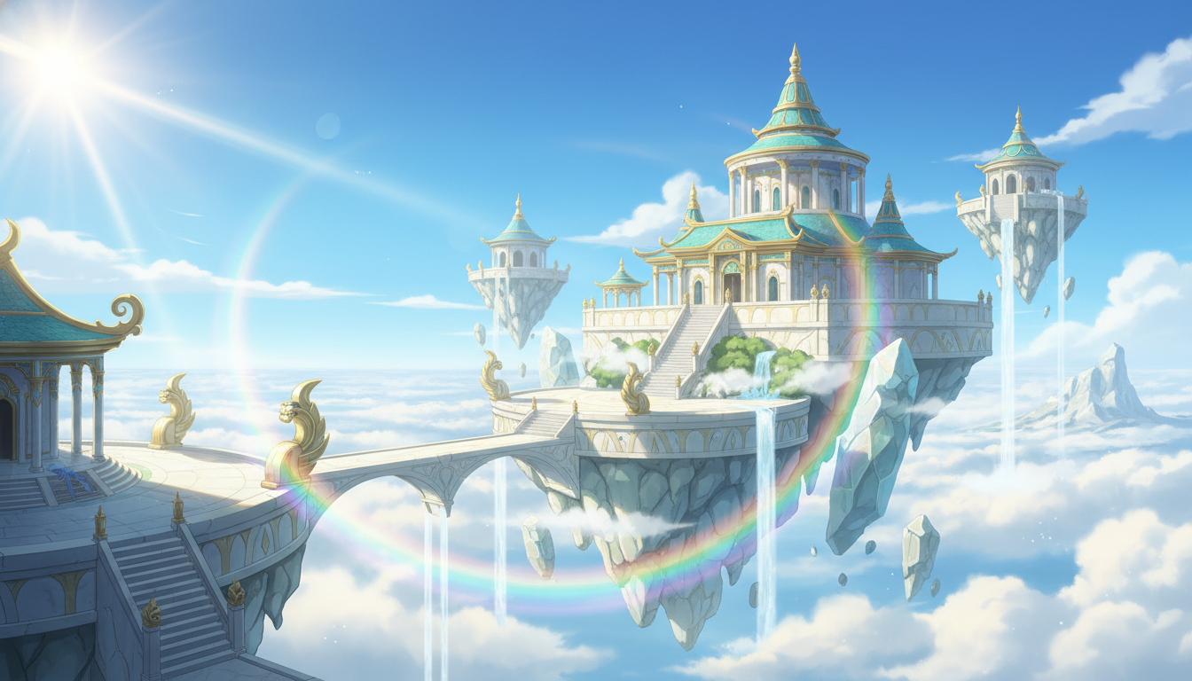 虹と光に包まれた天空神殿|幻想的ハイファンタジー素材
