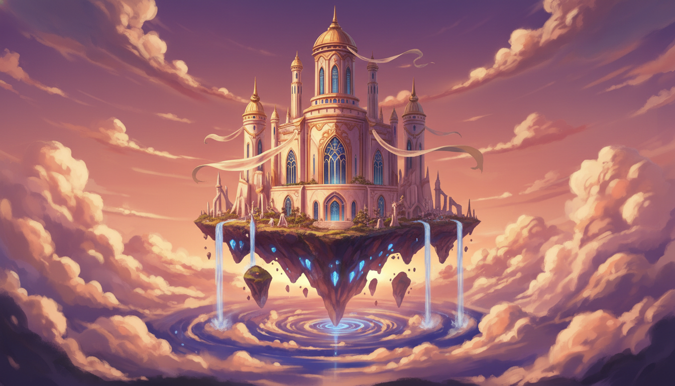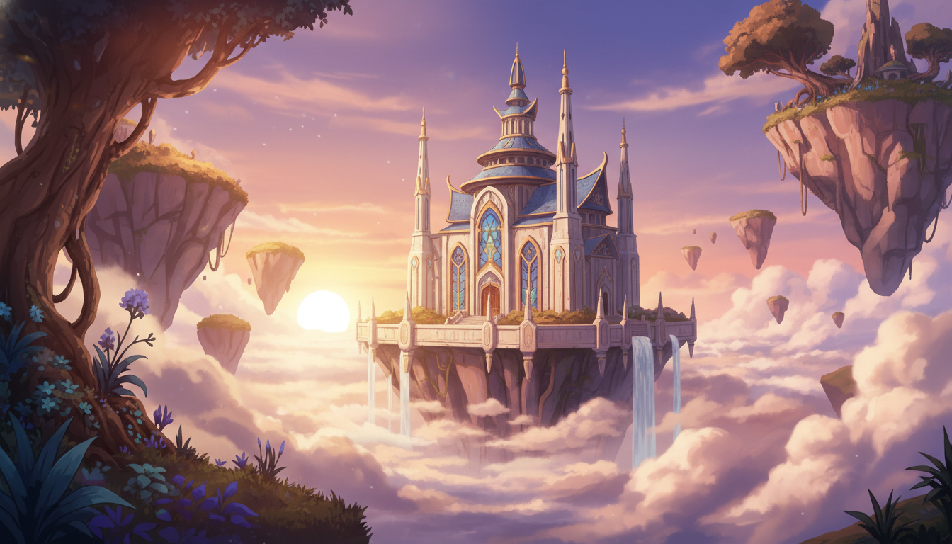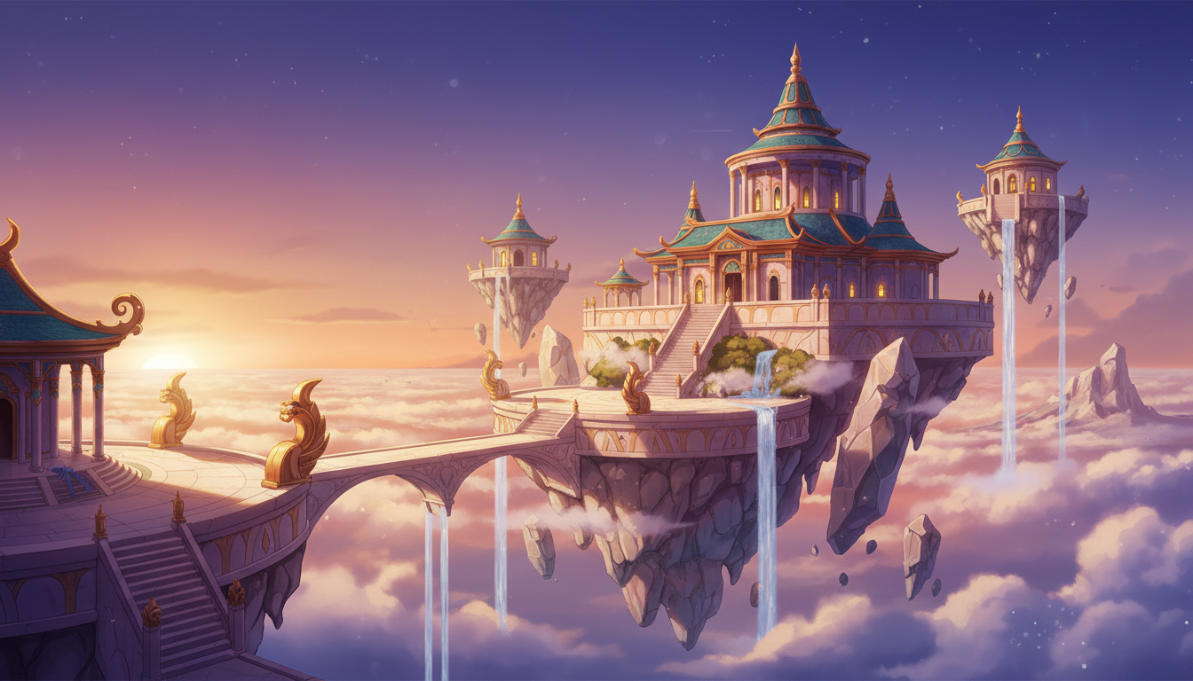 黄昏の天空神殿と浮遊島|シネマティック背景素材