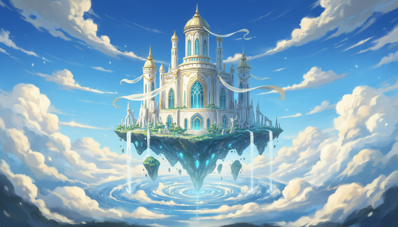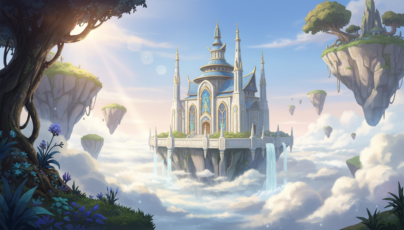浮遊する島々と神殿を広く捉えた、映画的スケール感のある天空神殿背景素材です。