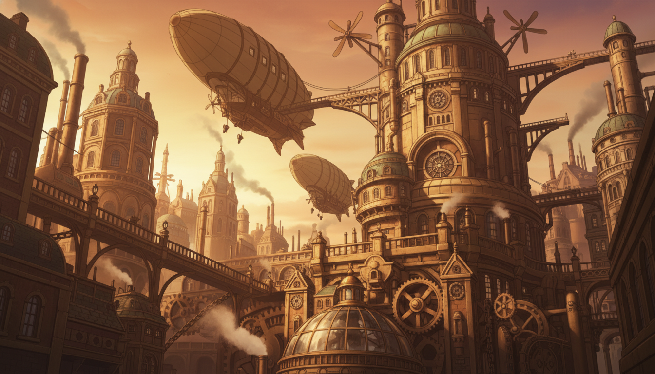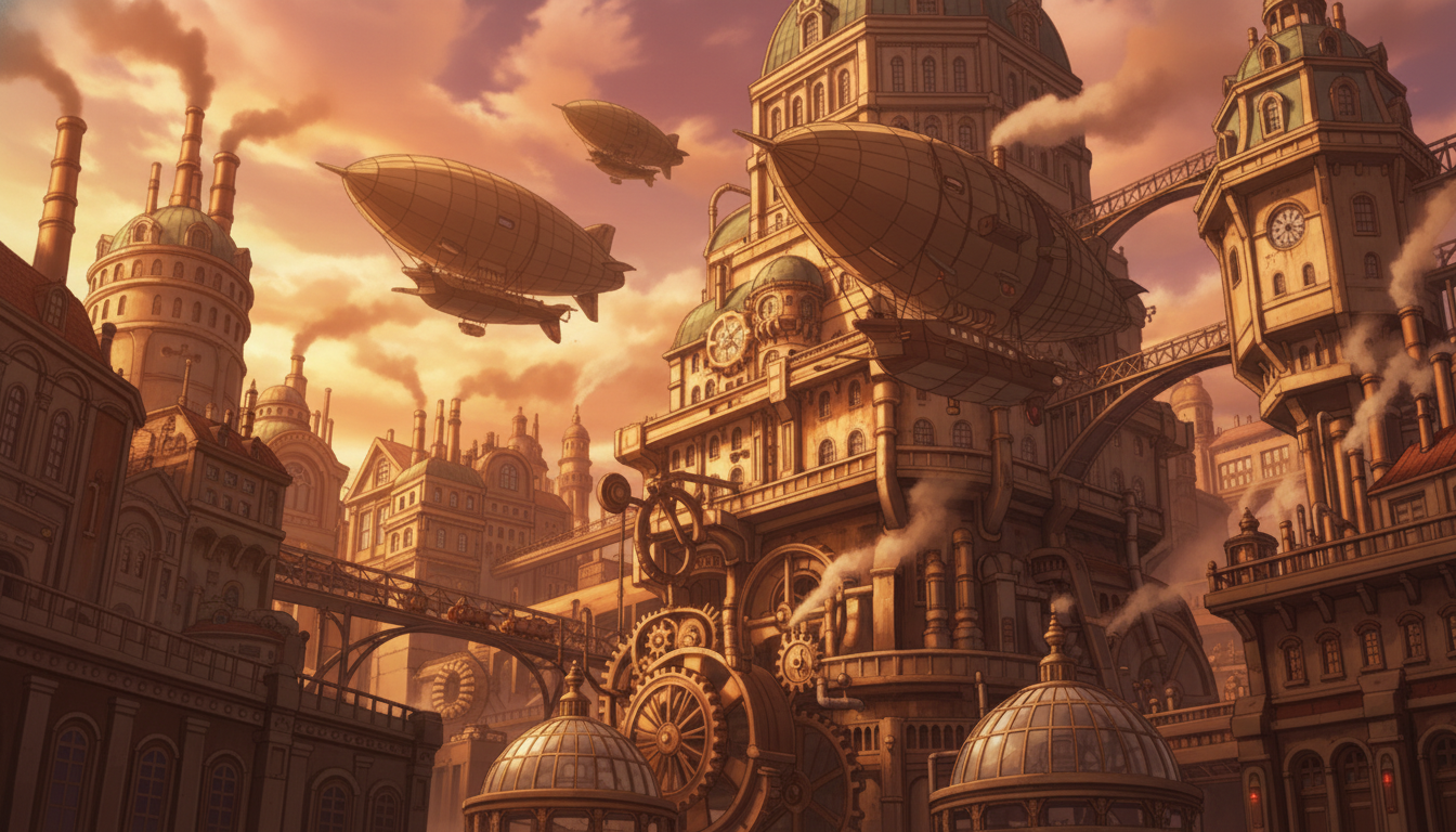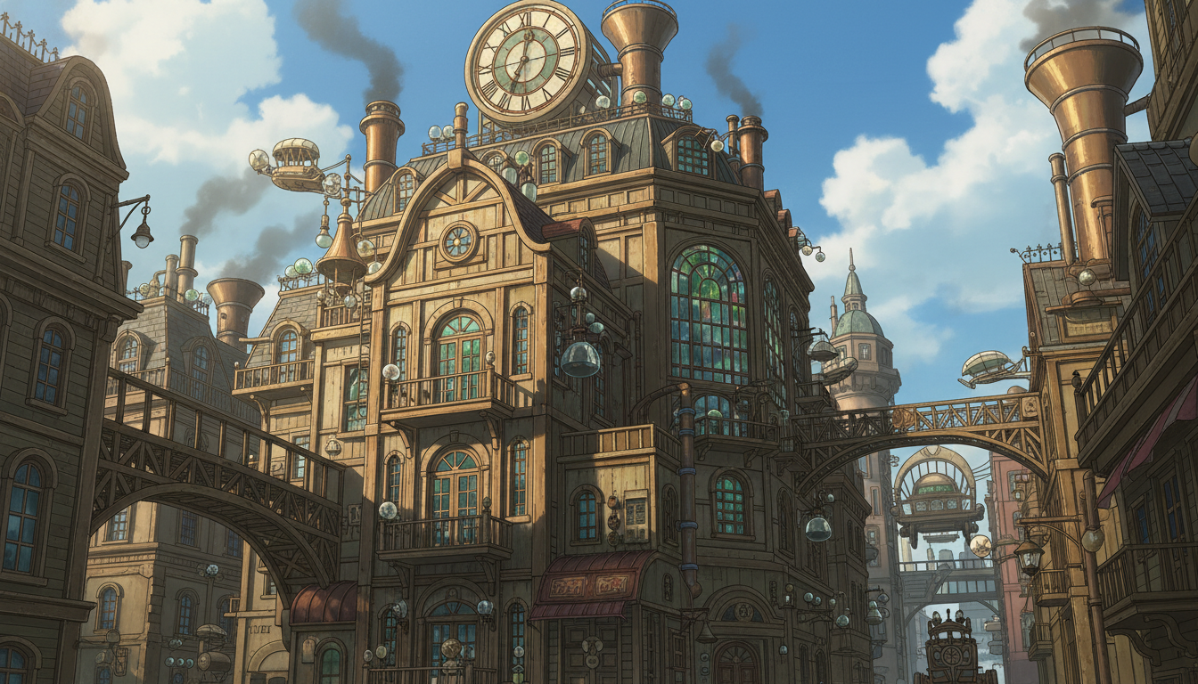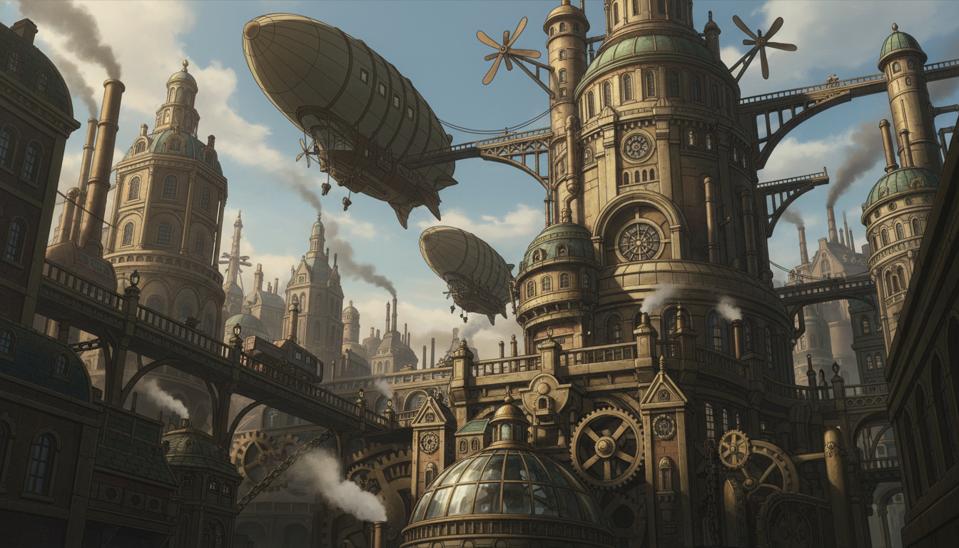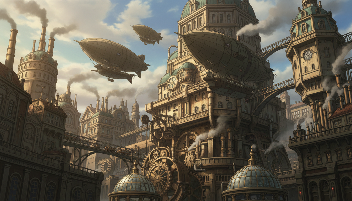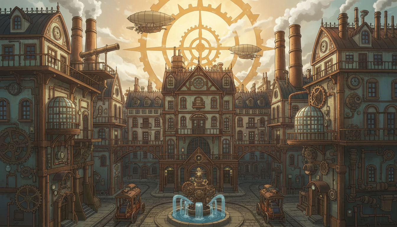青空の下で稼働する歯車と建築群が、活気あるスチームパンク都市を描き出します。
