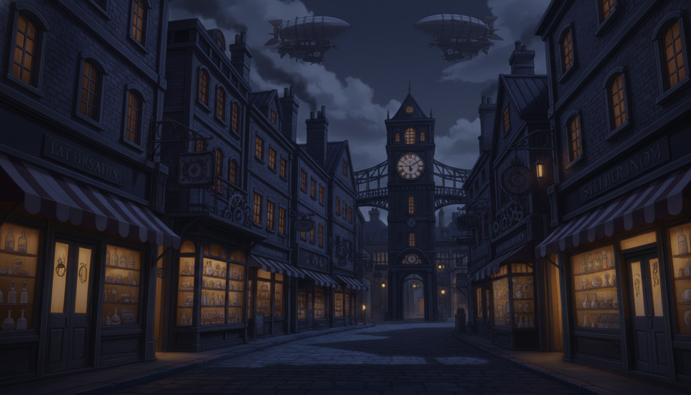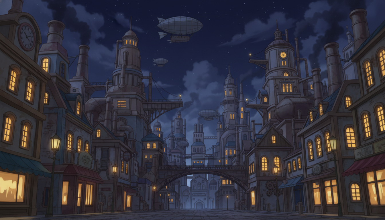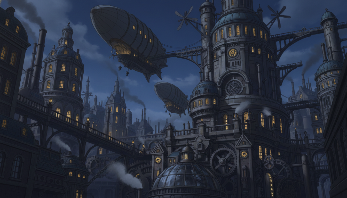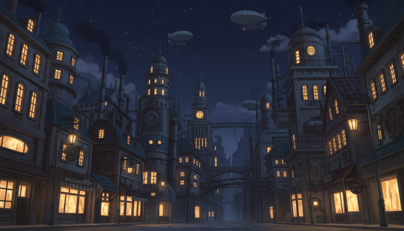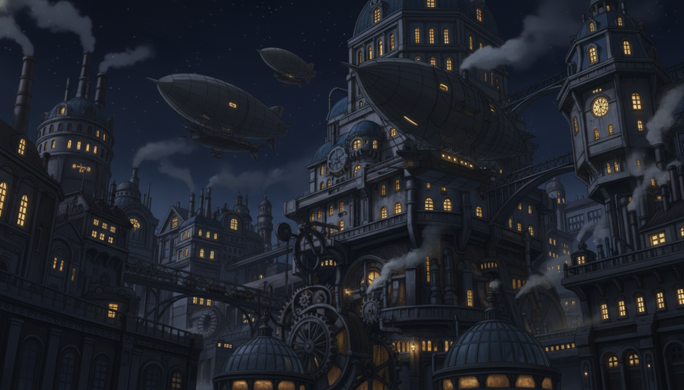 夜空に浮かぶ飛行船と灯りに照らされた時計塔が、幻想的なスチームパンク世界を演出します。