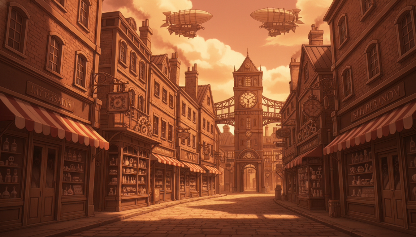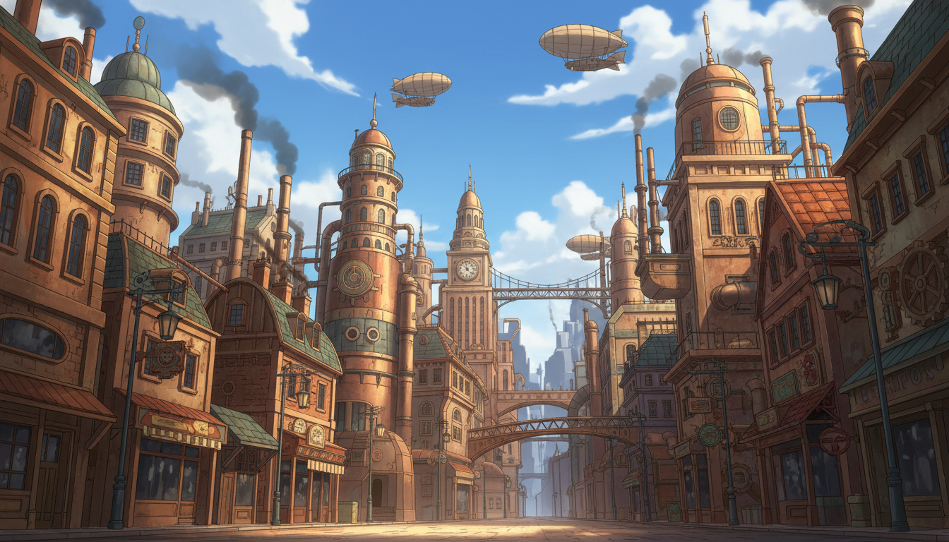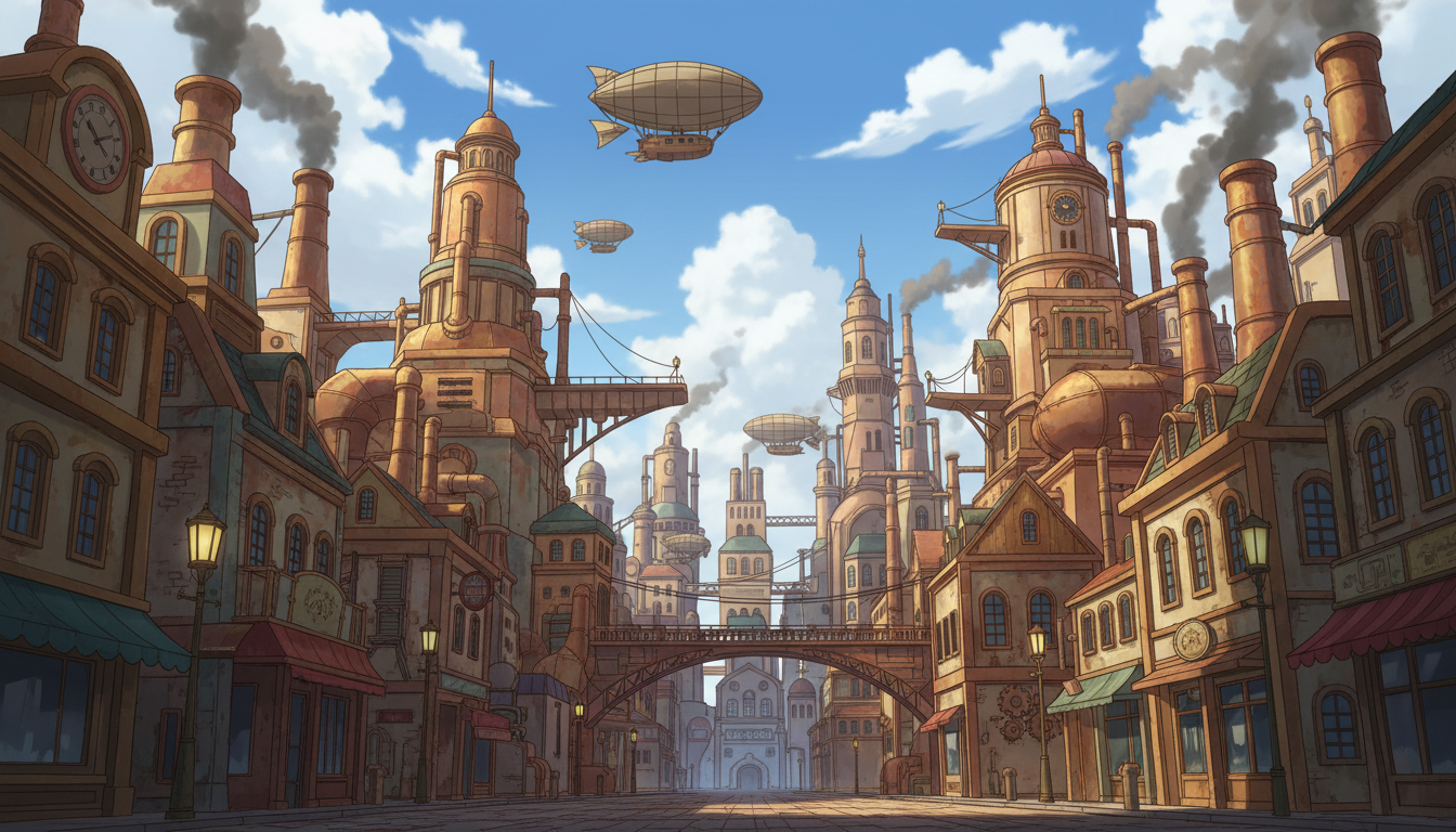 青空広がるスチームパンク街路|冒険感あふれる都市背景