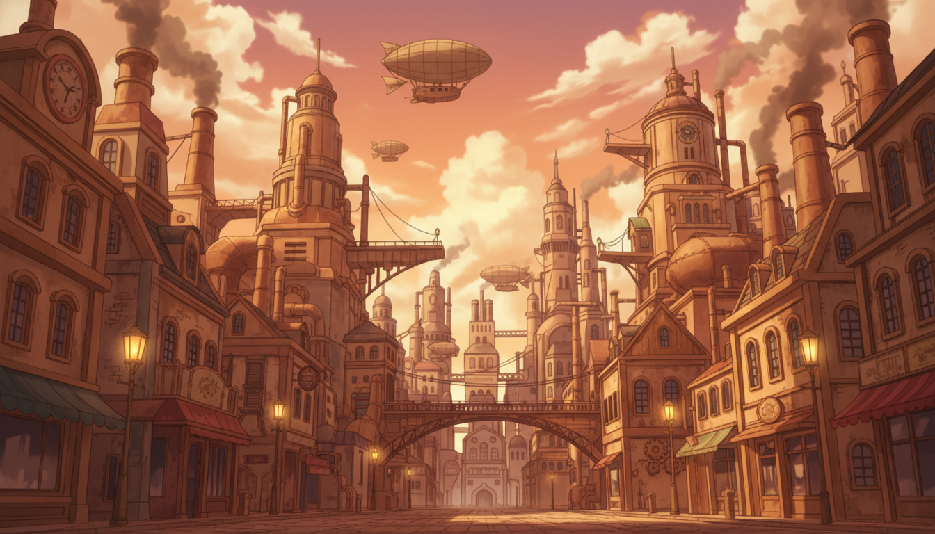 夕暮れの歯車街区|スチームパンク都市のノスタルジック風景
