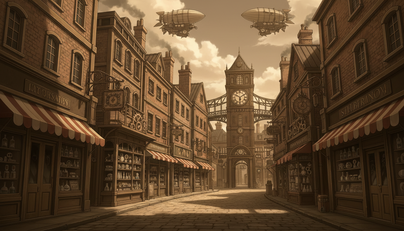 蒸気と石畳の街|昼のスチームパンク都市背景