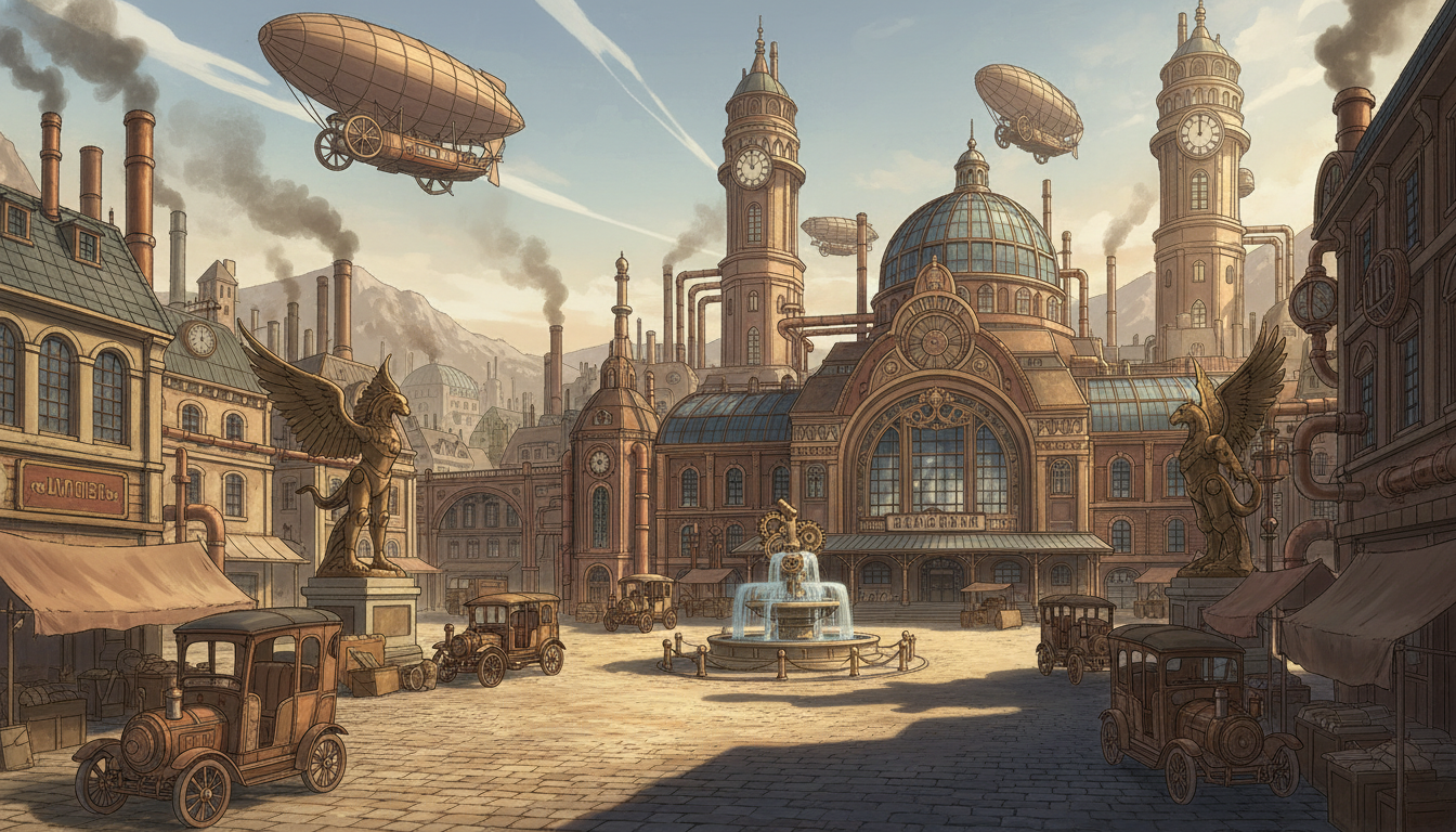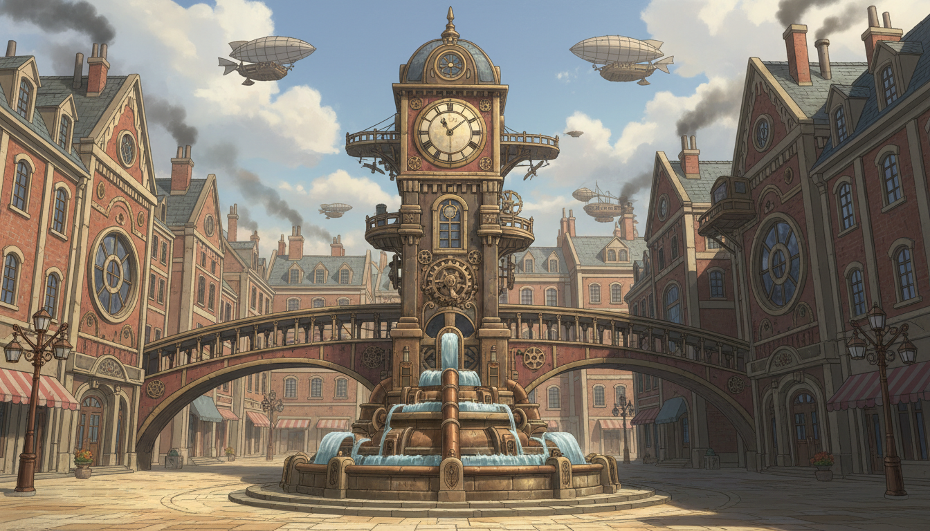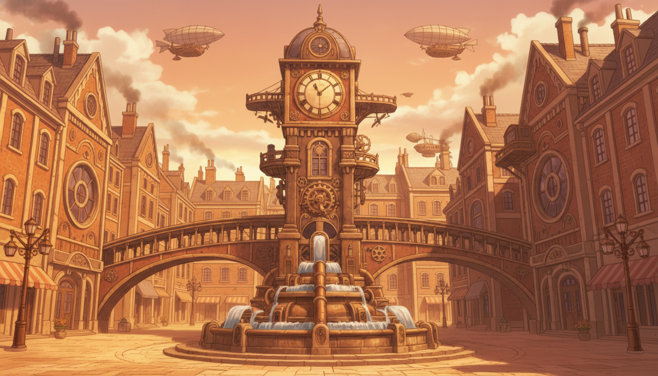 噴水と時計塔が印象的な昼の広場で、活気あるスチームパンク都市を描いています。