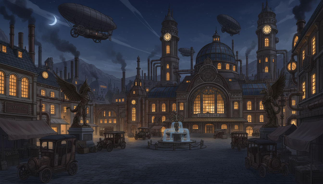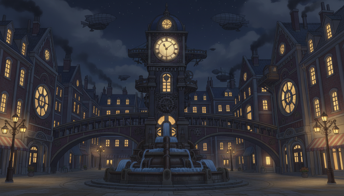 蒸気仕掛けの時計広場|夜のスチームパンク都市風景