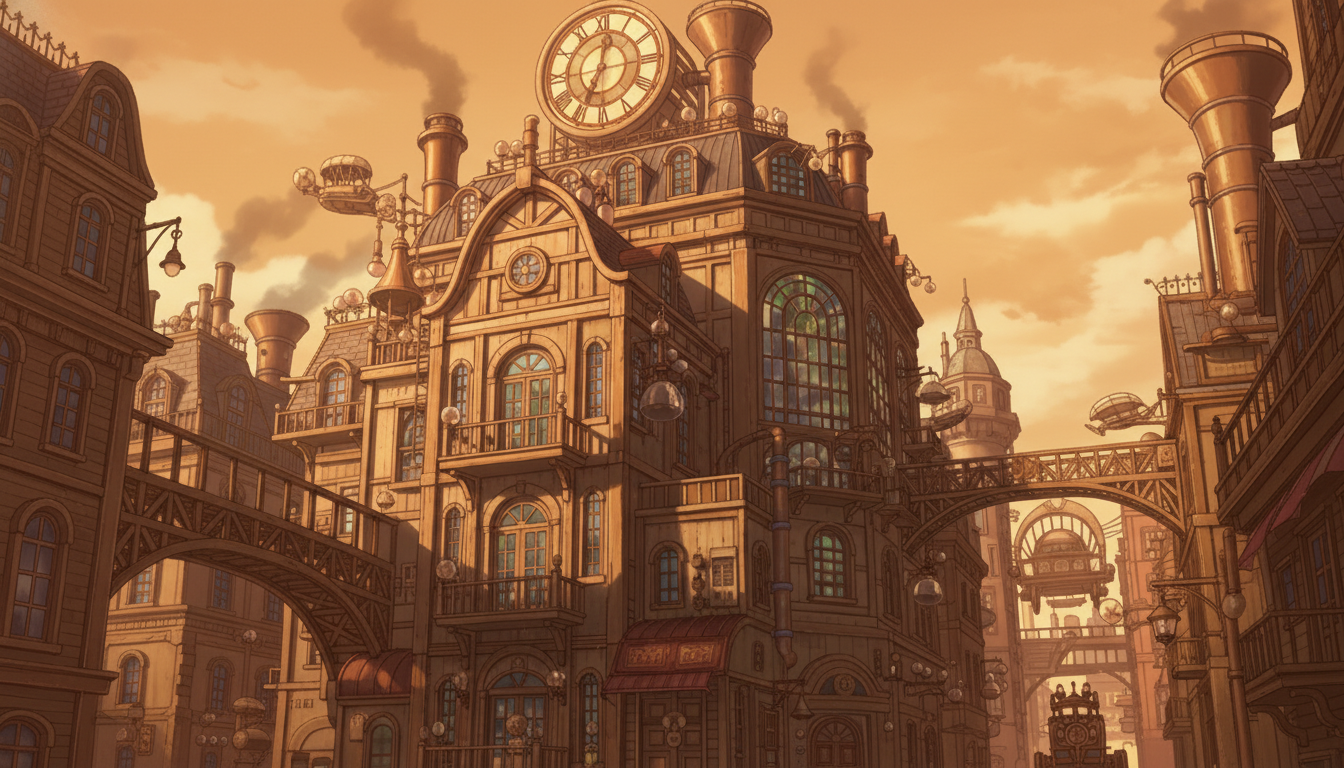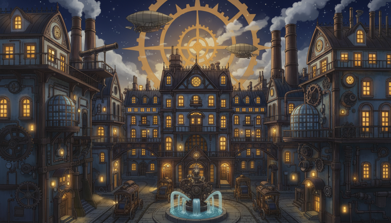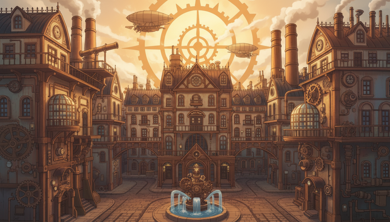 歯車機構が息づく工業都市|重厚スチームパンク建築背景