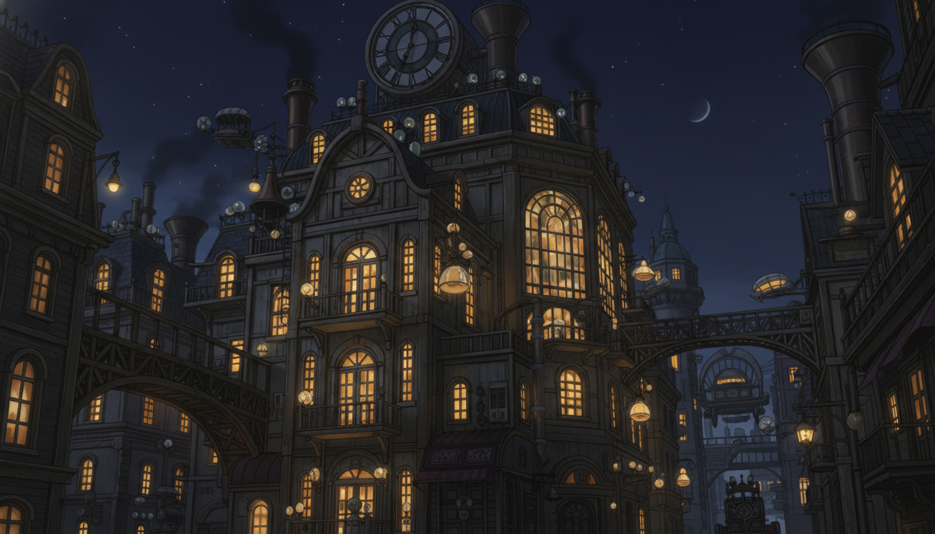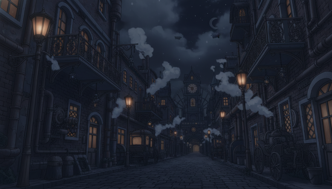 柔らかな灯りと蒸気が漂う夜のスチームパンク街並みを表現しています。