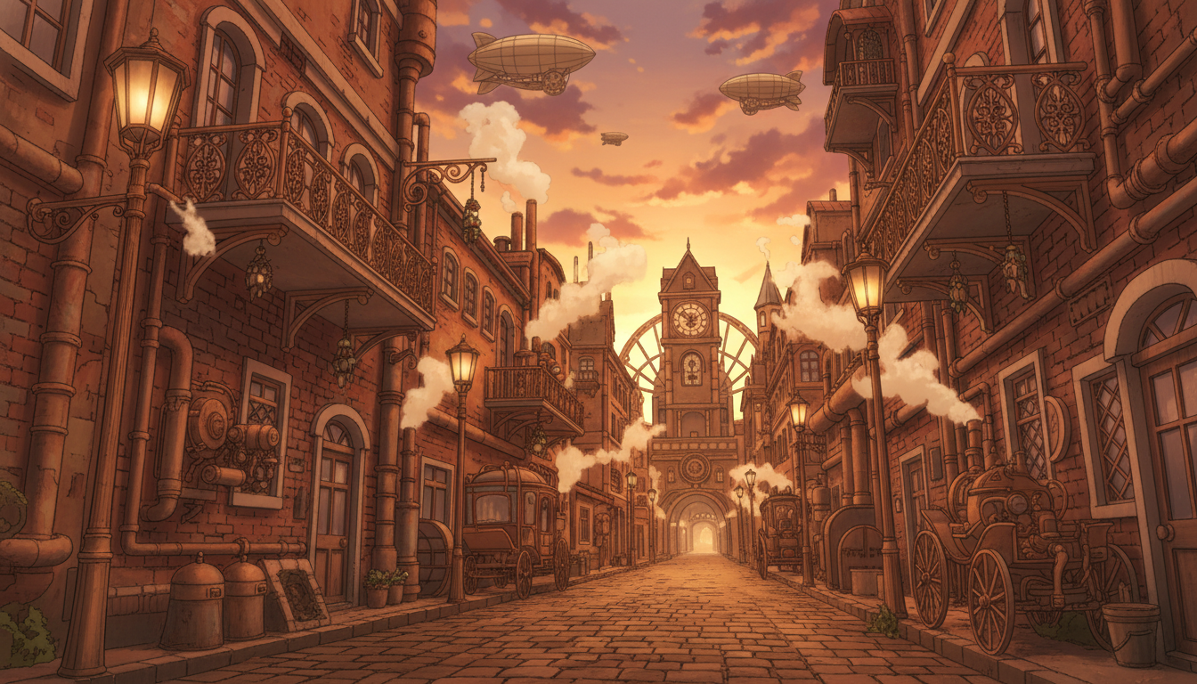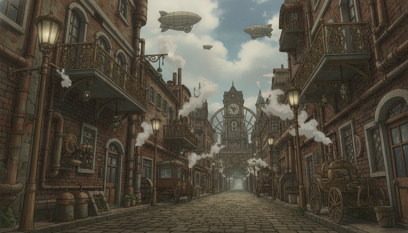 昼の蒸気街ストリート|スチームパンク都市の日常背景