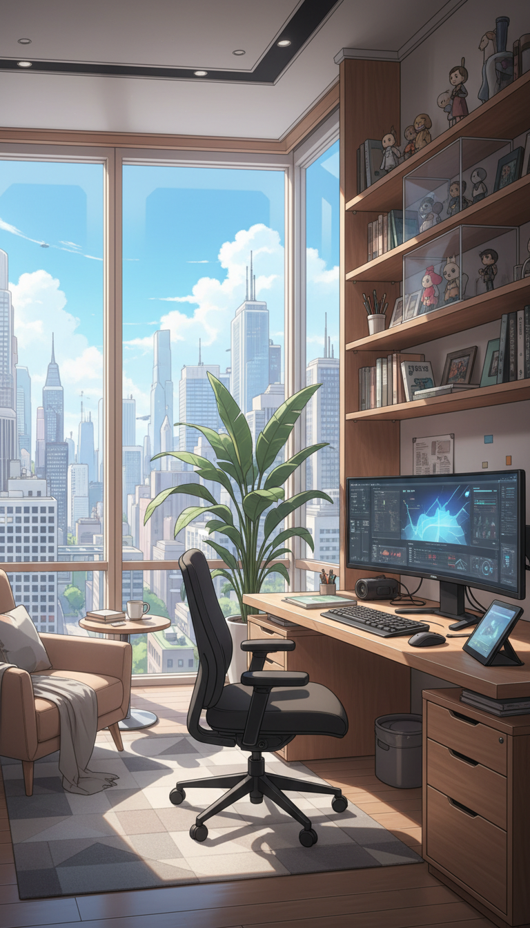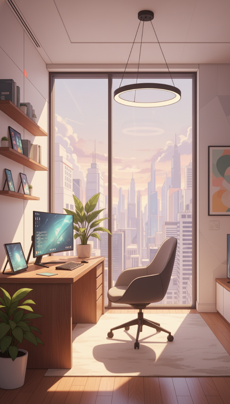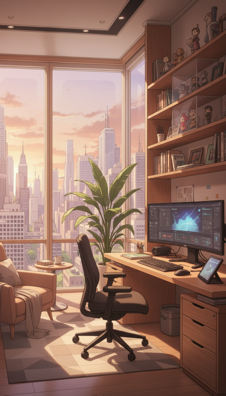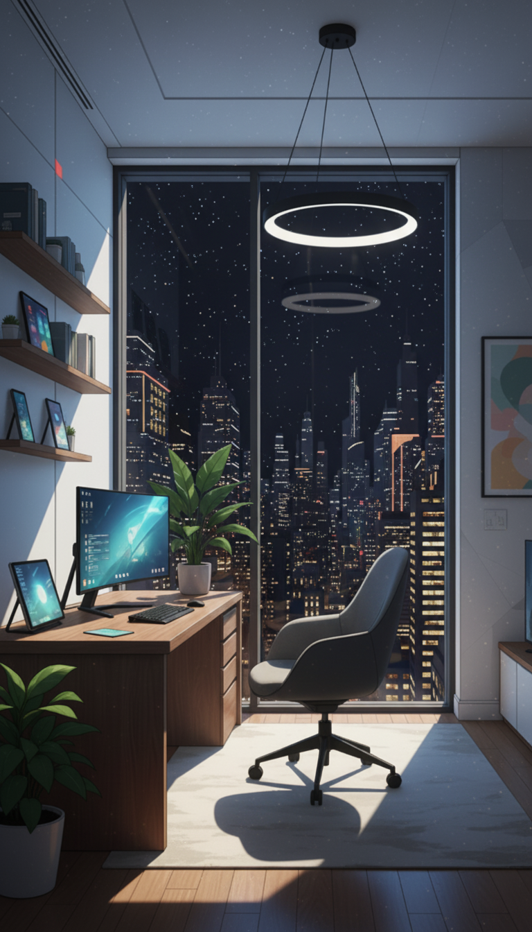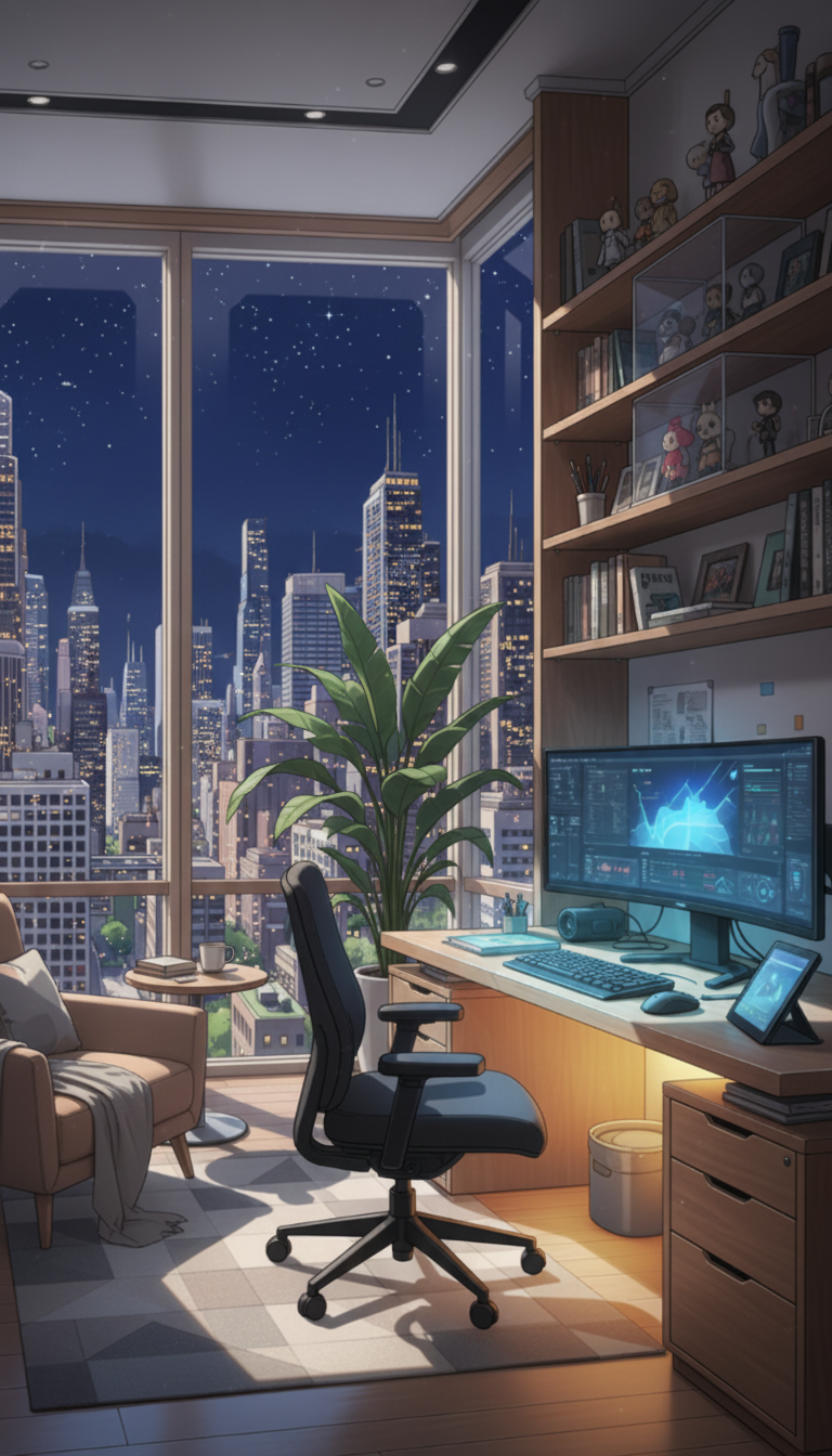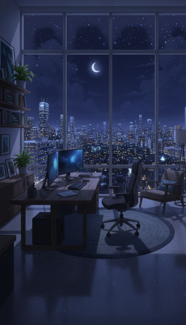 夜のクリエイター書斎|シティ夜景と集中のデスク