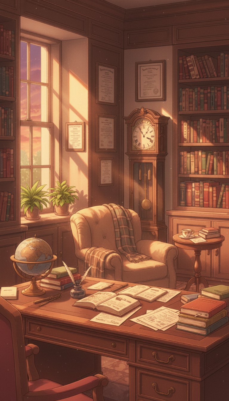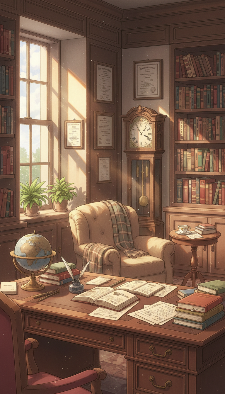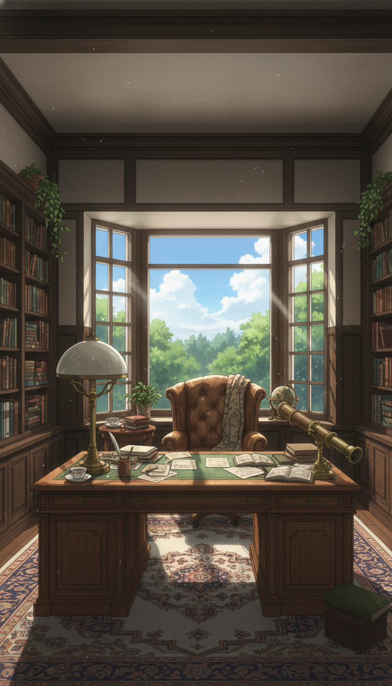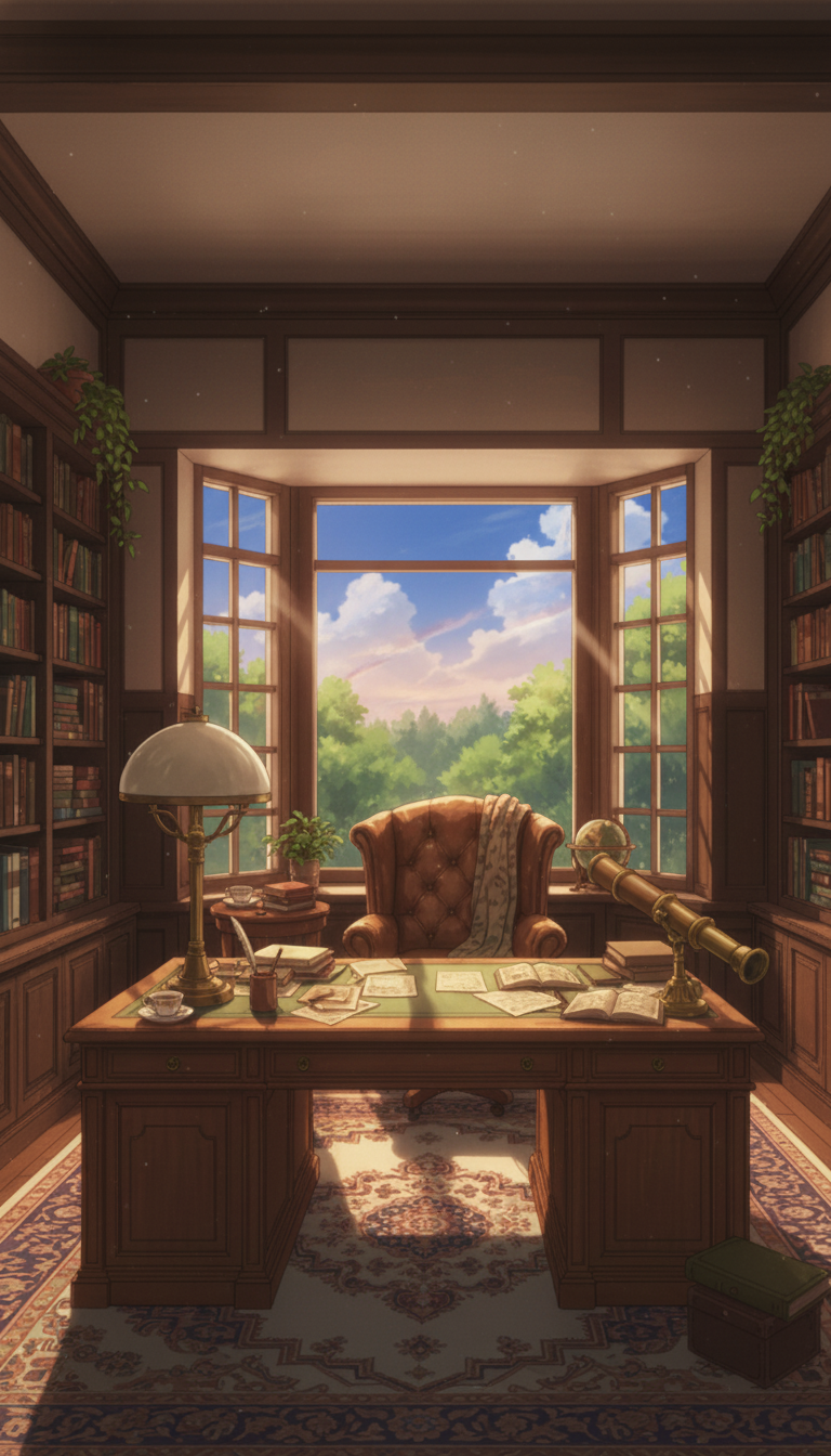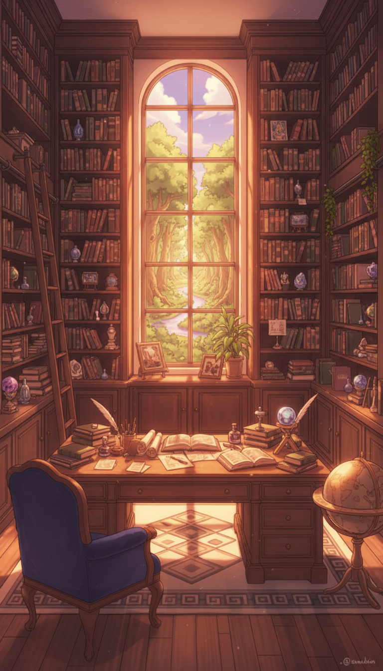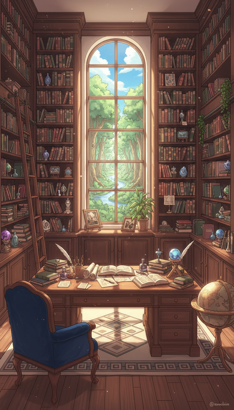 書斎の背景イラスト素材を無料配布。9:16の縦長構図でスマホ作品に使いやすい背景イラストです。漫画・Webtoonやゲーム背景として商用・トレース利用もOK!