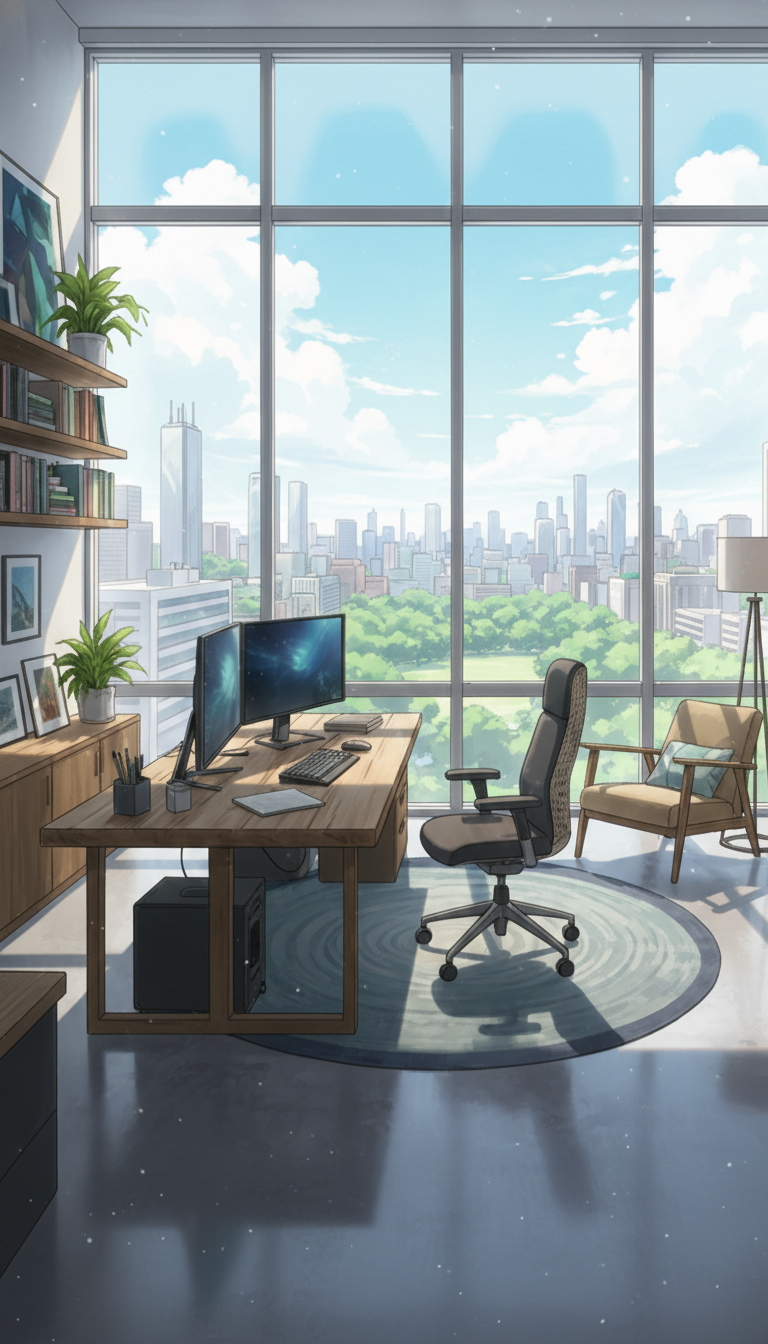 全面ガラス窓から都市景観が広がり、デュアルモニターのデスクが現代的な仕事空間を演出します。