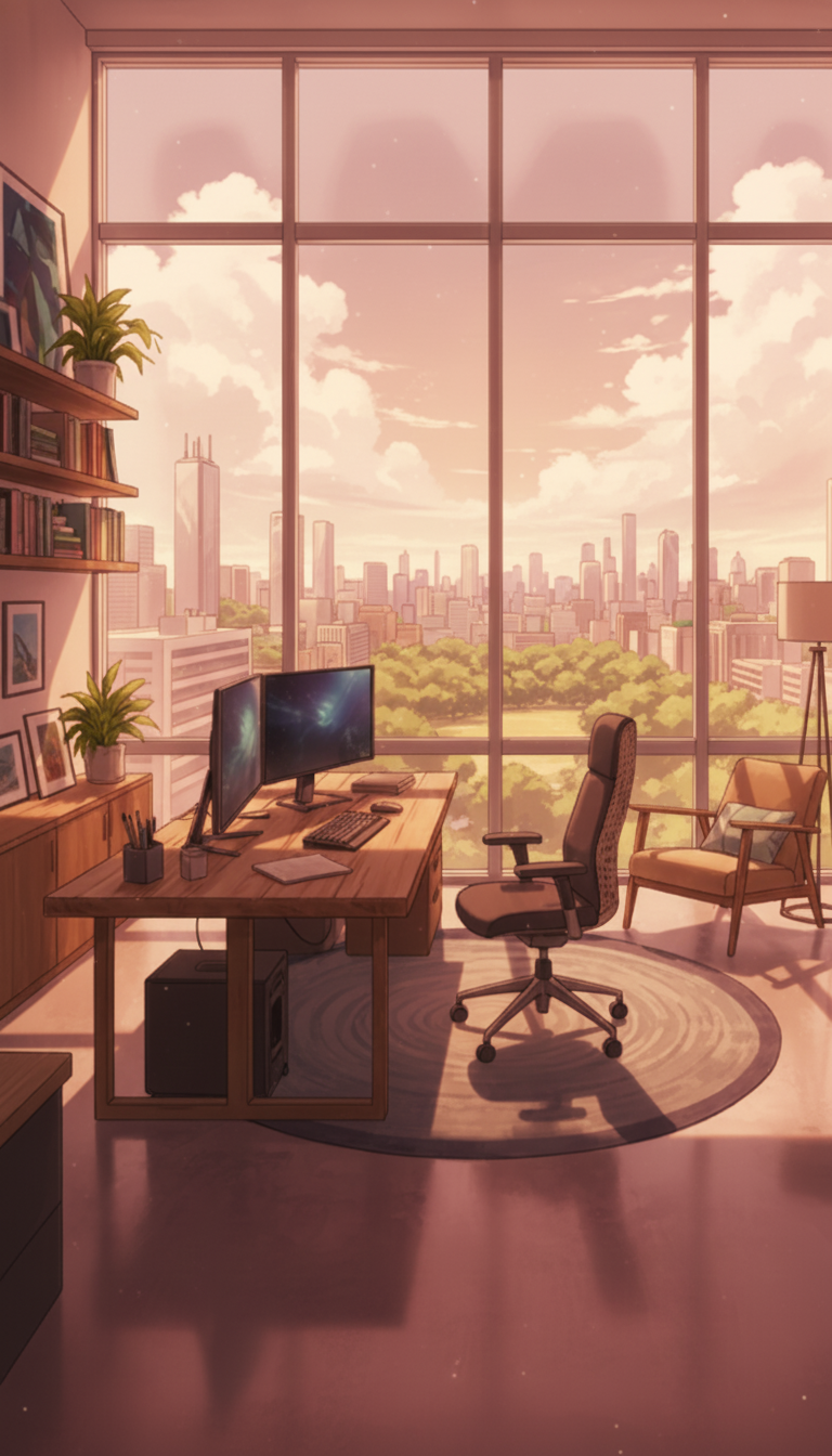 夕焼けの高層書斎|都会の景色と温かな仕事時間