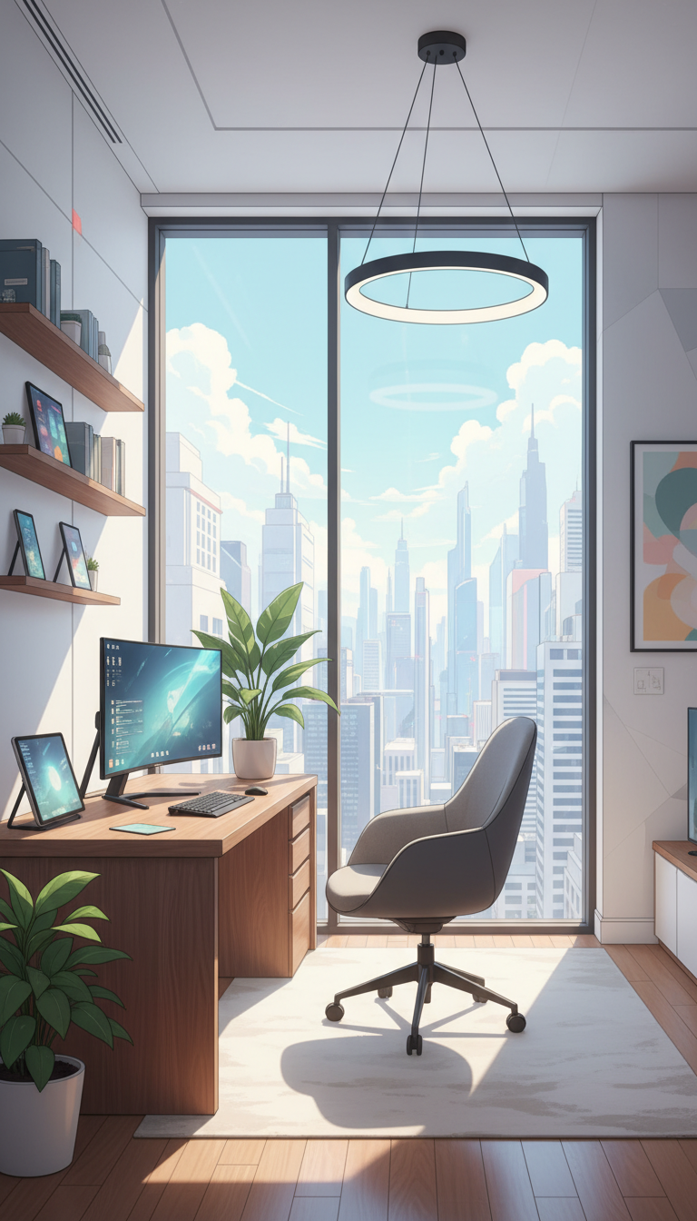 「都会夜景のモダン書斎|リングライトが映えるナイトワーク