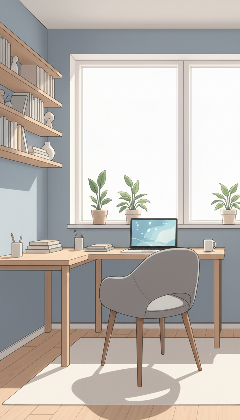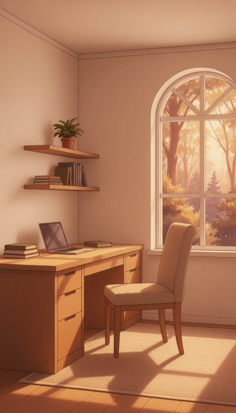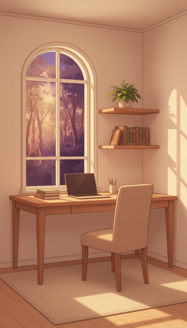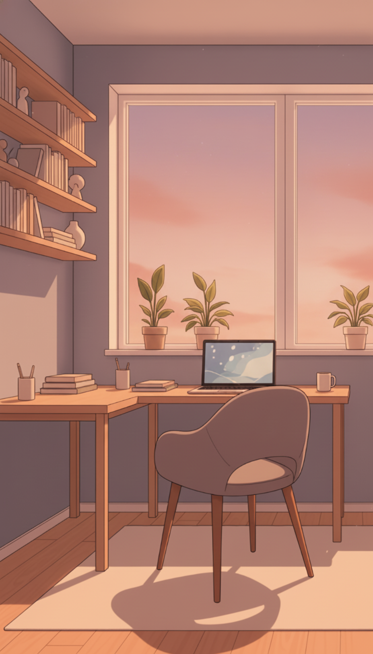 夕焼けのミニマル書斎|やわらかなトワイライトワークスペース