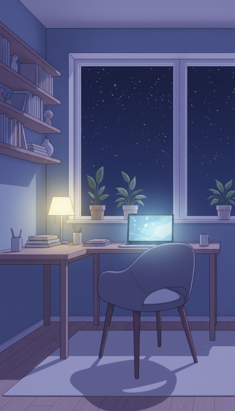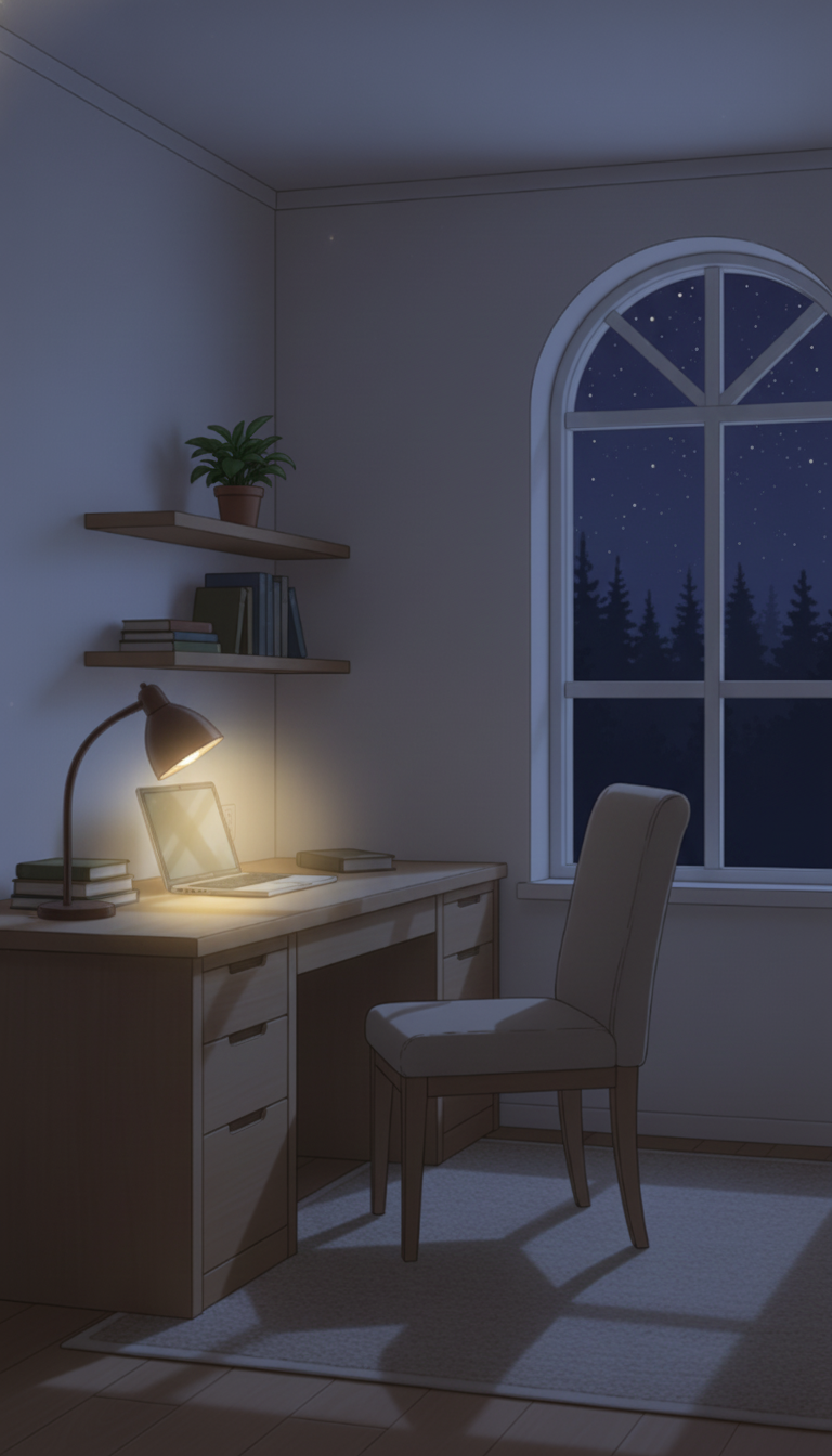 星空のミニマル書斎|デスクライトが灯る静かな夜