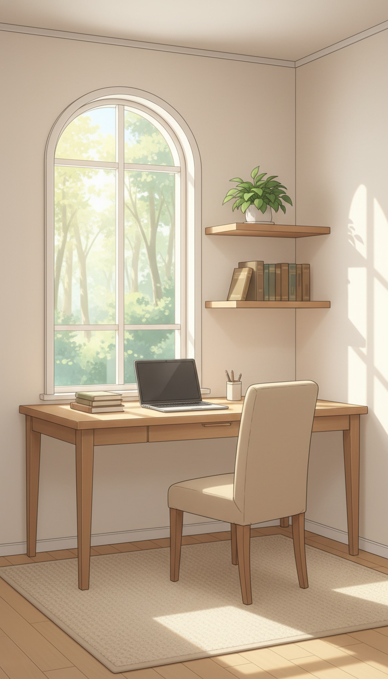 アーチ窓のナチュラル書斎|木漏れ日が差す癒しの作業部屋