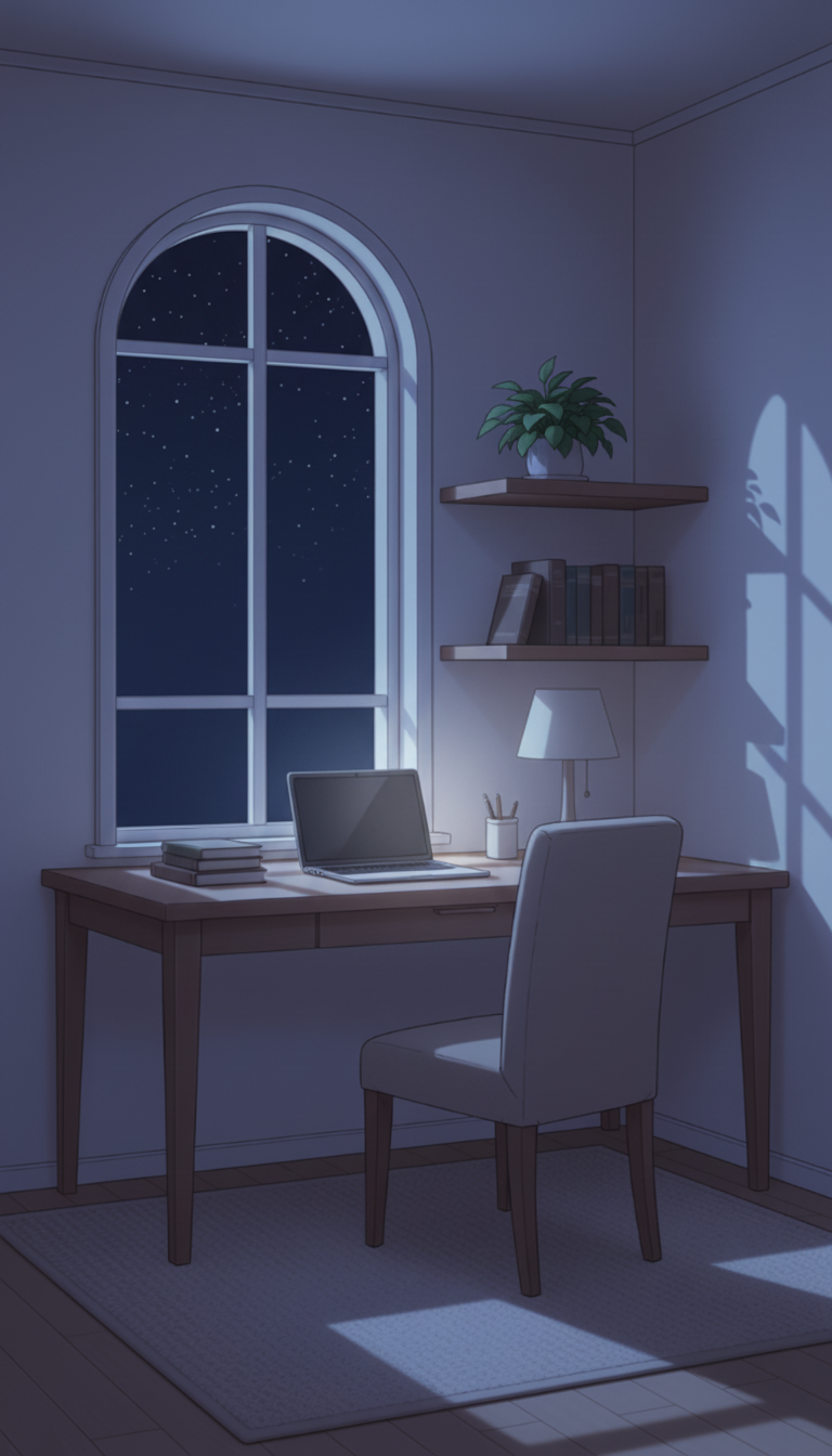 夜空の光が室内に差し込み、静けさと集中を感じさせる夜の書斎シーンです。